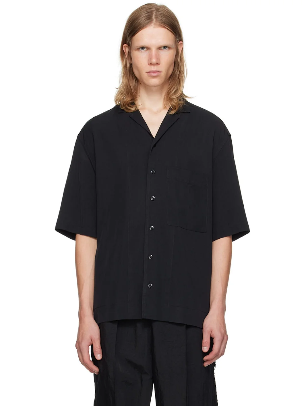 Oversized viscose twill shirt. · Open spread collar · Button closure · Patch pocket · Vented side seams · Dropped shoulders · Logo flocked at back yoke Supplier color: Black 100% viscose. Made in Australia 242699M192003