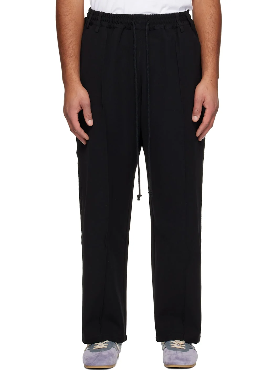 Gabardine trousers. · Belt loops · Drawstring at elasticized waistband · Four-pocket styling · Pinched seam at front legs · Faux-suede panel and raw edges at curved outseams · Grosgrain trim at back cuffs · Logo patch at back waistband Supplier color: Black Body: 100% polyester. Trim: 68% acetate, 32% polyester. Pocket lining: 100% cotton. Made in Australia 252699M191001