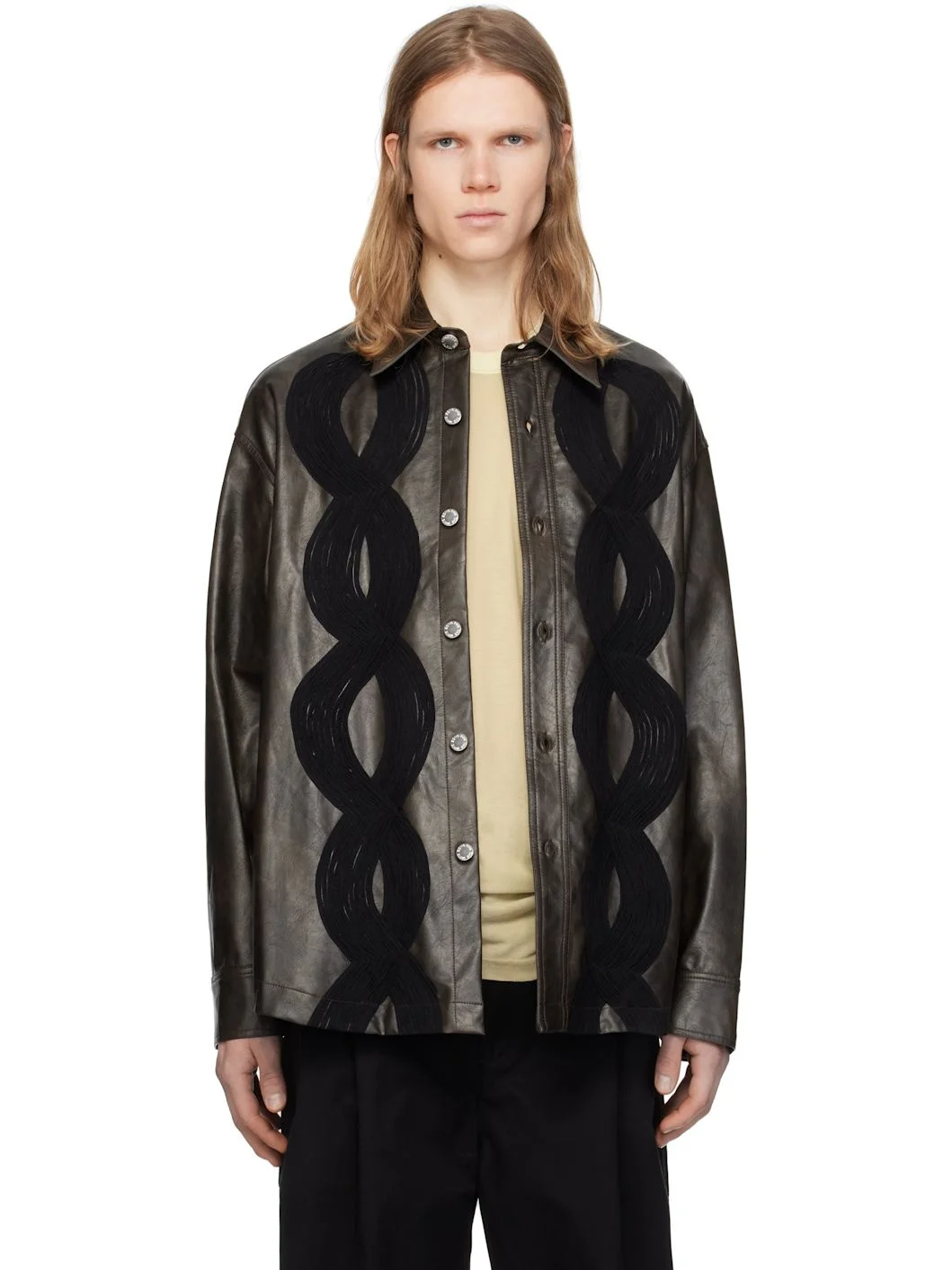Oversized grained faux-leather overshirt. · Spread collar · Button closure · Hand-embroidered appliques at front · Seam pockets · Dropped shoulders · Single-button barrel cuffs · Logo-engraved silver-tone hardware Supplier color: Dark brown Body: 100% rayon. Trim: 100% nylon. Lining: 100% cotton. Made in India 251699M180002