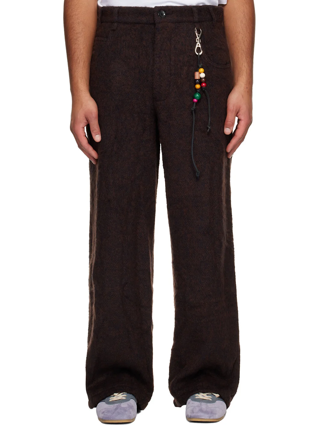 Brushed wool-blend melton trousers. · Belt loops · Four-pocket styling · Button fly · Detachable beaded lanyard at waist · Leather logo patch at back waistband Supplier color: Brown 42% wool, 24% polyamide, 18% acrylic, 16% mohair. Made in Australia 252699M191003