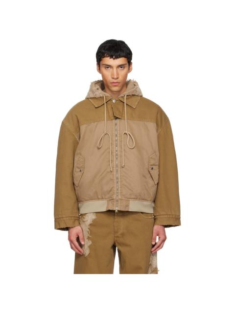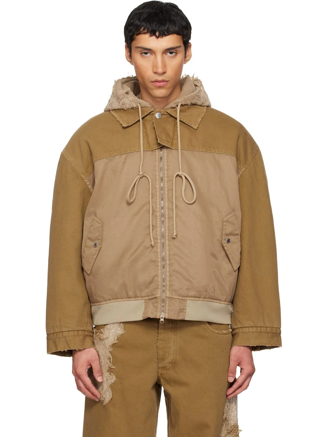 Insulated non-stretch denim and nylon twill jacket. · Fading and sequinned applique with frayed edges throughout · Drawstring at hood · Spread collar · Two-way zip closure · Flap pockets at front · Rib-knit hem · Dropped shoulders · Adjustable buttoned barrel cuffs · Full quilted poplin lining Part of the Song for the Mute x TKL collaboration. Supplier color: Khaki Body 1: 100% cotton. Body 2: 100% nylon. Trim 1: 100% cotton. Trim 2: 100% nylon. Lining: 100% cotton. Made in India 261699M177001