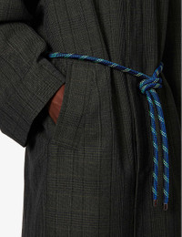 PRODUCT DETAILS - Song For The Mute wool-blend coat - 65% wool, 35% polyester; lining 100% cupro - Concealed button fastening at front - Relaxed fit, spread collar, long sleeves, straight cuffs, belt loops, detachable cord belt, two welt pockets at front, all over check print, fully lined, single vent - Specialist dry clean only - Made in Australia - Size UK 40: length 47 in / 120 cm, chest 60 in / 152 cm - Model is 6 ft 2 in/1.88 m and wears a size UK 40 - Heavyweight, stretchy