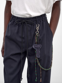 Navy wool-blend pants with elasticated waistband and signature carabiner and rope charm. Featuring: • Relaxed fit • Wide leg • Elasticated waistband and belt loops • Adjustable drawstring in waistband • Signature carabiner and rope with charm • Concealed fly • Side pockets and back welt pockets • Back logo patch • Made in Australia • 50% Wool 50% Polyethylene • Italian sizing Model is 5'11.5" wearing size 48. Shoulders: 16" Chest: 32.5" Waist: 30"