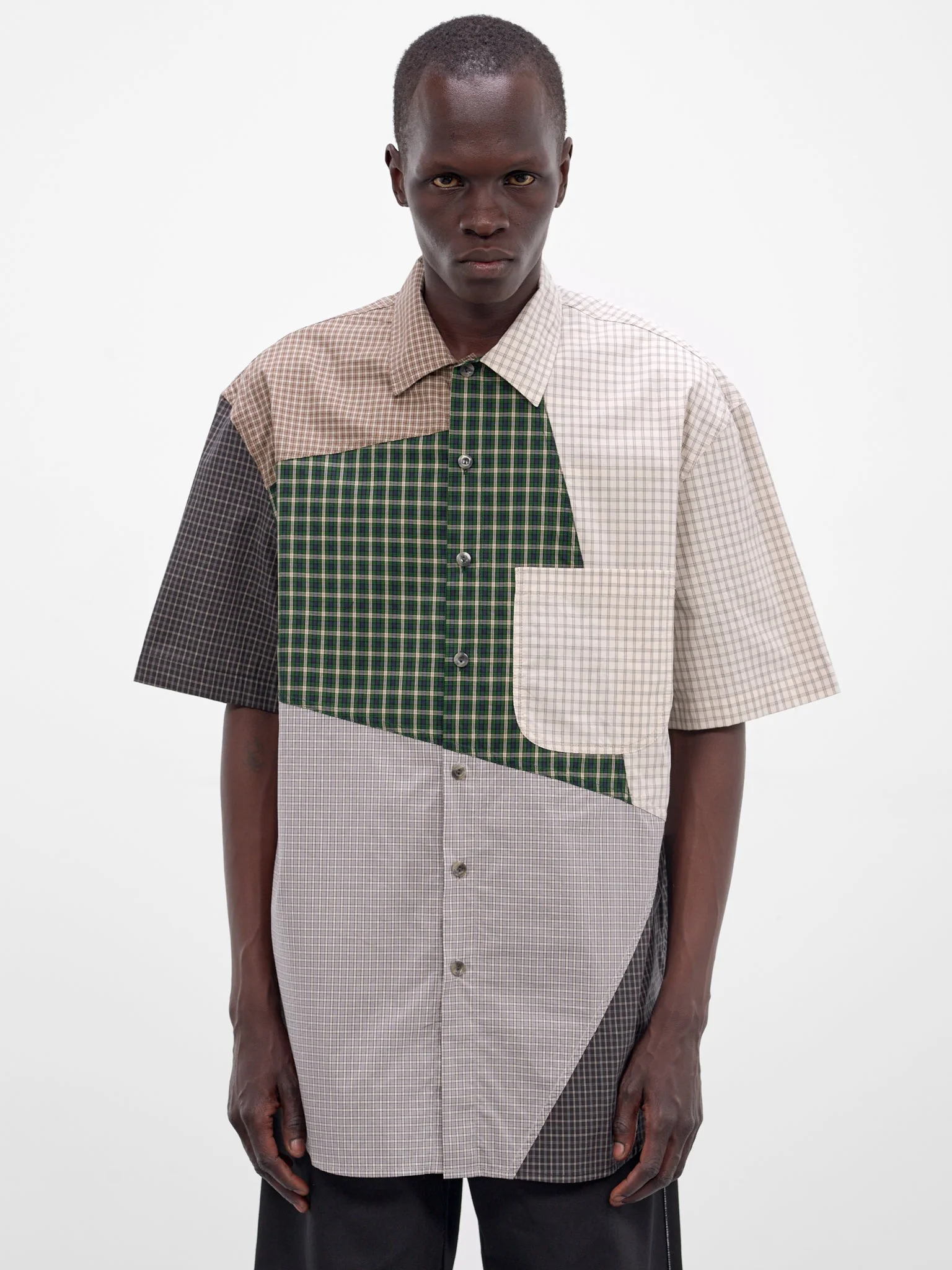 Neutral cotton shirt with patchwork plaid pattern and dropped shoulders. Featuring: • Oversized fit • Patchwork plaid pattern • Spread collar with front button placket closure • Dropped shoulders with short sleeves • Chest patch pocket and shirttail hem • Made in Australia • 100% Cotton • Italian sizing Model is 5'11.5" wearing size 48. Shoulders: 16" Chest: 32.5" Waist: 30"