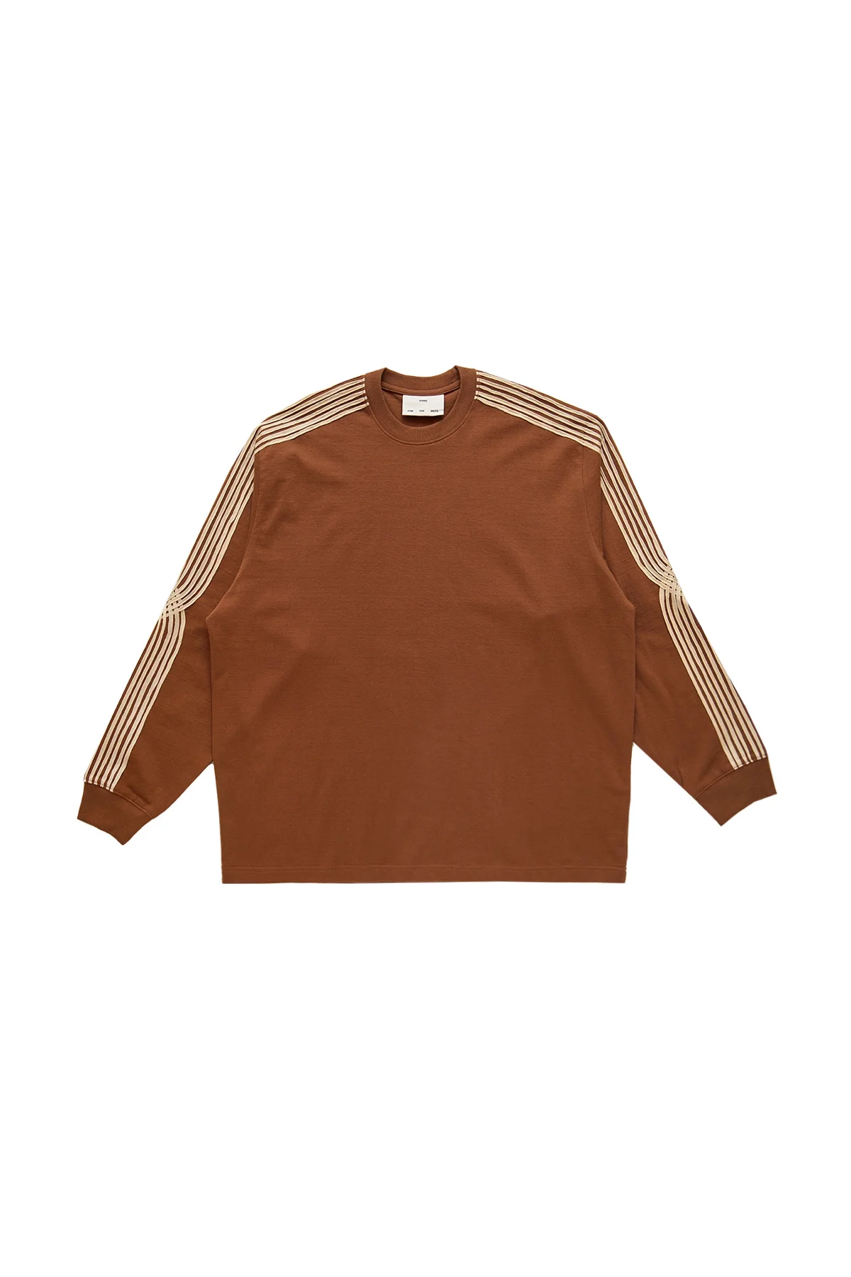The Song For The Mute Applique Crew Neck Pullover in treated heavyweight Japanese jersey cotton with an oversized silhouette, dropped shoulders, and rib-knit cuffs. DETAILS - Oversized silhouette - Treated heavyweight jersey - Crewneck - Nylon applique at arms Sizing: - True to size Material: 100% Cotton Applique: 100% Nylon Made in India Product codes: - SKU: ESSX/SFT/SS25/251MJP017ASOFTBRN/Brown/46 - UPC: 9360823010077