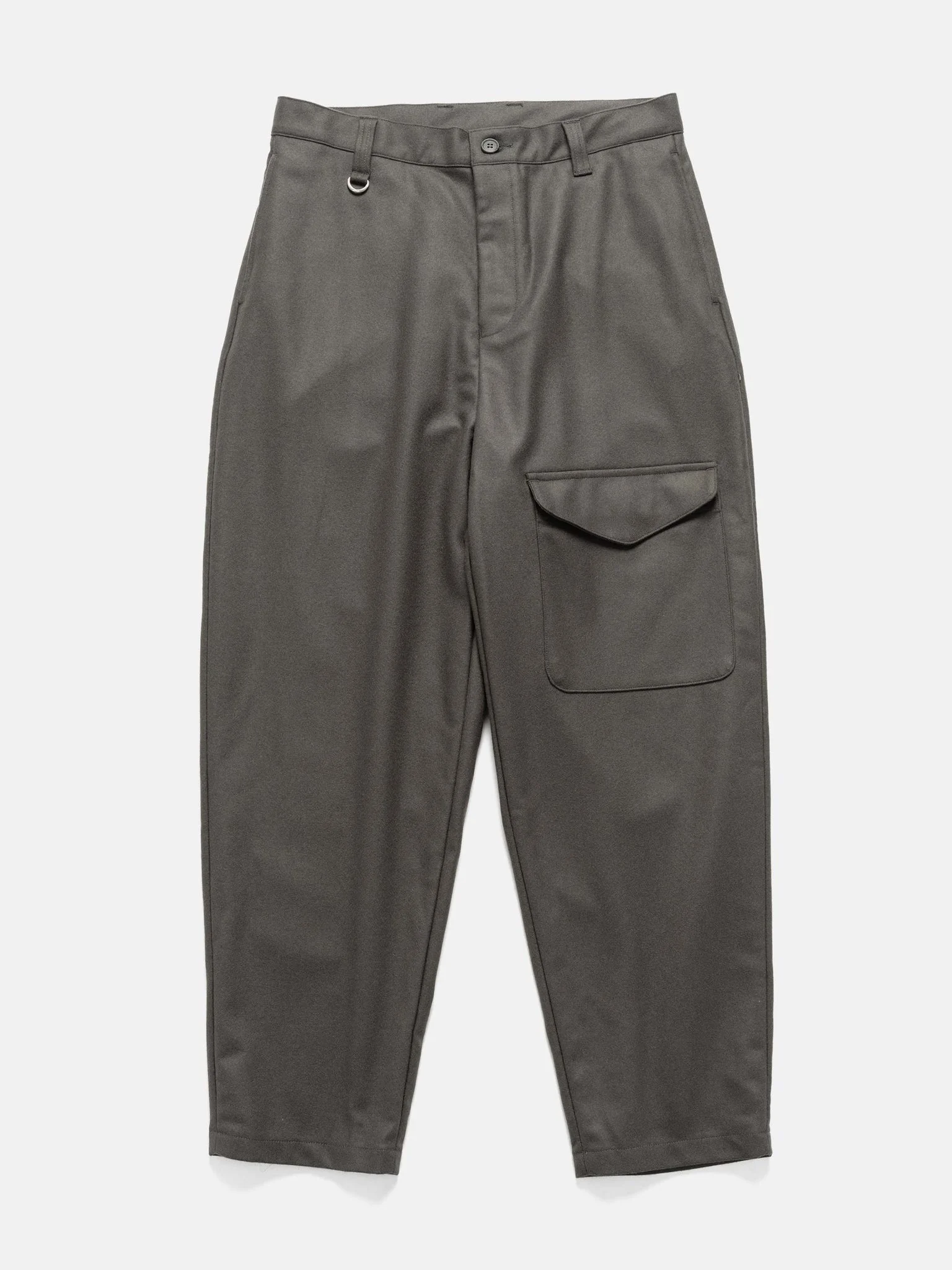 These military-inspired pants are crafted from soft, light Melton lambswool with a subtly fluffy, matte finish. The silhouette widens at the knee and tapers at the hem for a balanced, modern fit, while the distinctive flap pocket adds functional detail. Understated design and matching fabric elevate these pants into refined, versatile pieces suitable for both casual and polished looks. DETAILS - SPNT-252004 - 100% Wool - Relaxed fit with slight taper - Inseam hand pockets - Welt rear pockets - Flap patch pocket at leg - Zip fly and button closure - D-ring at waist - Made in Japan