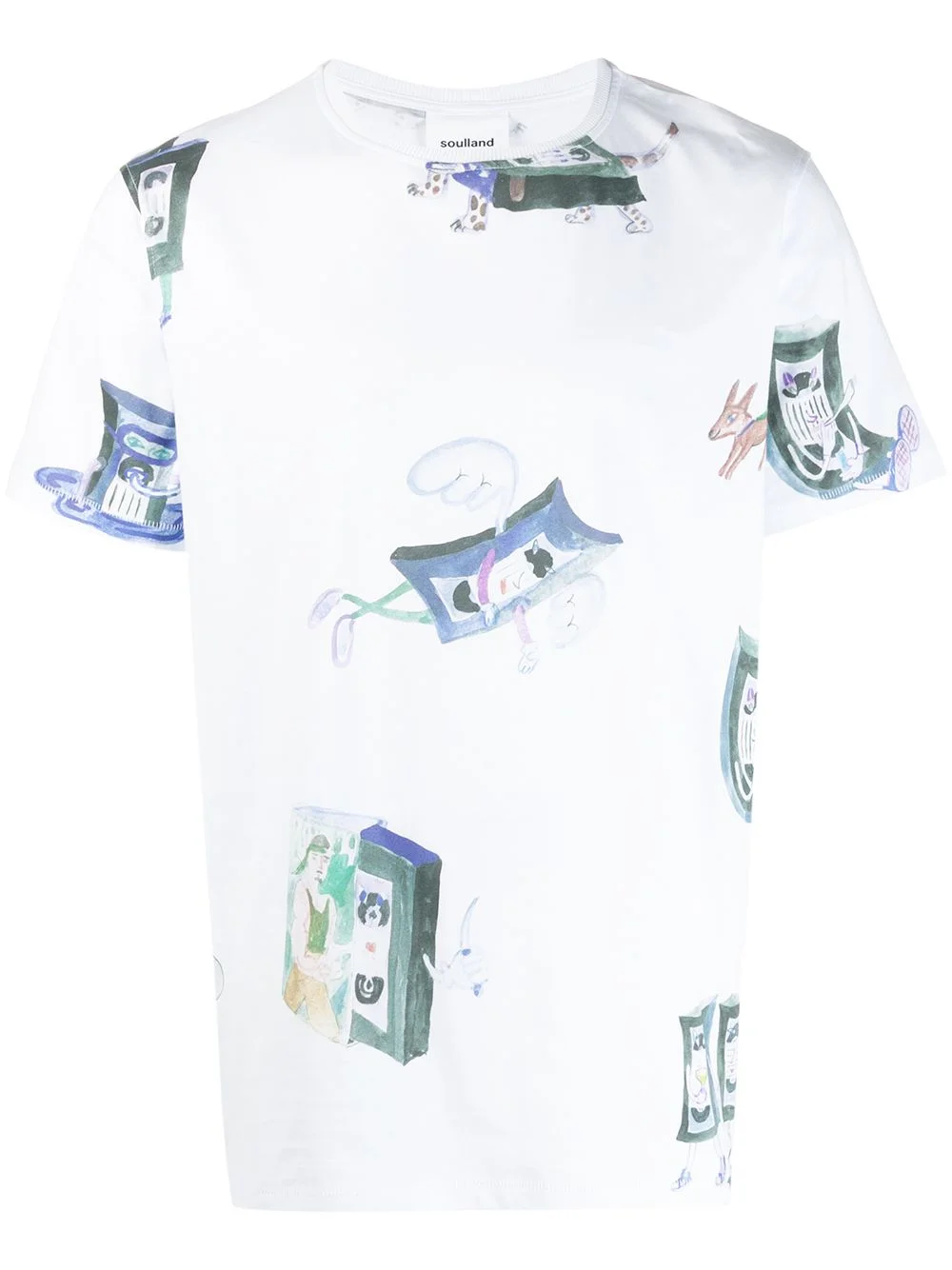 Archie T-shirt White cotton Archie T-shirt from Soulland featuring a ribbed crew neck, an all-over print, short sleeves and a straight hem. Imported Composition Cotton 100% SIZE & FIT Model measurements Height 6 ft 2 in(1.87 m) Bust/Chest 38.18 in(97 cm) Hips 36.61 in(93 cm) Waist 29.13 in(74 cm) FittingInformation This piece fits true to size. We recommend you get your regular size Cut for a relaxed fit