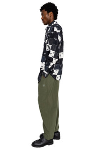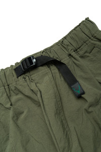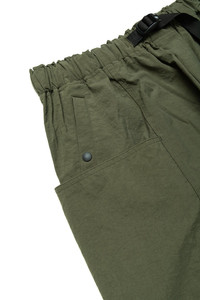 - Elastic waist with belt - 3 stitched center seam - Relaxed wide fit - Slide pocket with snap button - Overlapping pockets on both sides - A drawcord on the hem - Color: Olive - 100% nylon - Made in Japan - Model is 6'2 wearing a size M