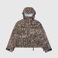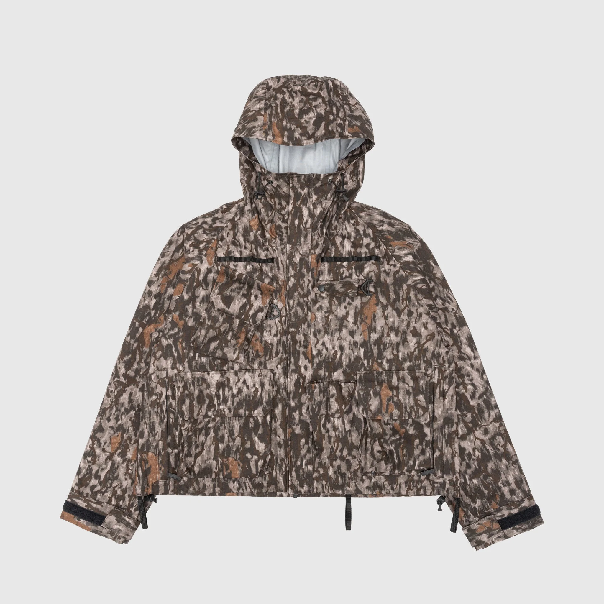 - PU441-HRN - A- Horn Camo A - 100% Cotton - Heavyweight cotton ripstop - Waterproof - All-over camo print - Front hidden two-way zip and velcro closure - Pullover hood with adjustable drawcord - Three front pockets with flap and velcro closure - Hidden side zippered pockets - Adjustable velcro cuffs - Drawcord hem - Cropped fit - Made in Japan