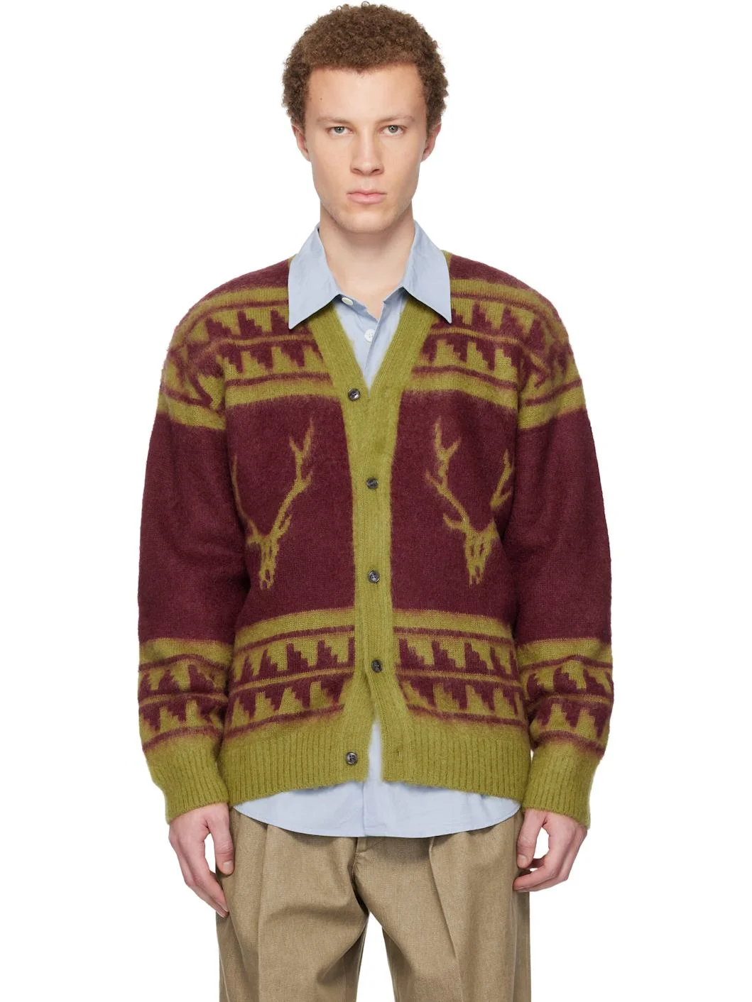 Brushed knit mohair-blend cardigan. · Jacquard graphic pattern throughout · Rib-knit Y-neck, placket, hem, and cuffs · Button closure · Dropped shoulders Supplier color: Wine 55% mohair, 30% nylon, 15% wool. Made in Japan 252294M200001