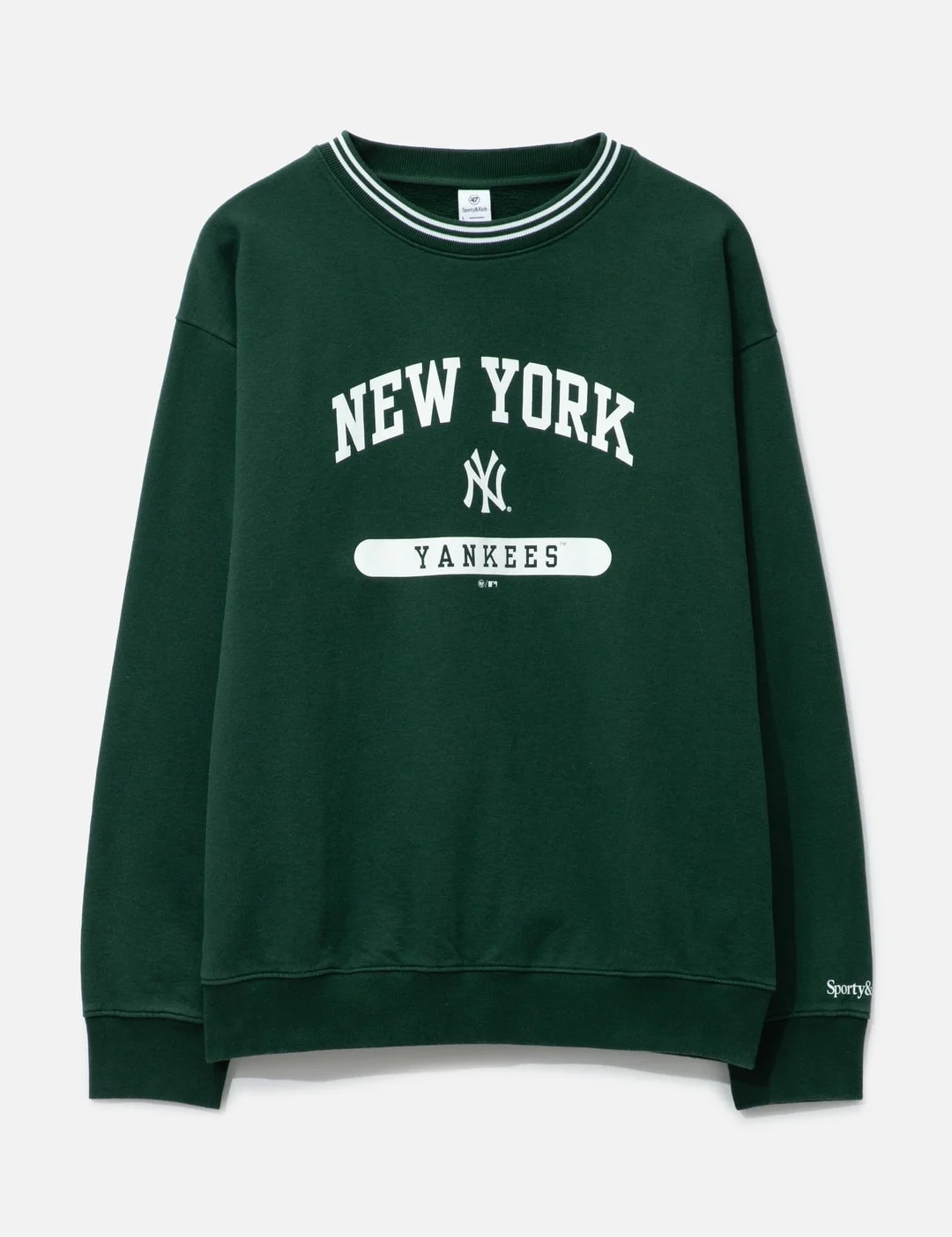 - Sporty & Rich - League Crewneck - Sporty & Rich x NY Yankees collaborative collection - Ribbed crewneck, cuffs, and hem - Co-branding logo at front - Fleece lining - Color: Forest - Material: 100% Cotton - See more Sweatshirts and Clothing SIZING Male - Model wears size L - Model measures: Height 183cm, Chest 35.5"/90cm, Waist 30"/76cm, Hip 33"/84cm - Model wears size S - Model measures: Height 177cm, Chest 32”/81cm, Waist 23.5”/59.7cm, Hip 33’’/83.8cm
