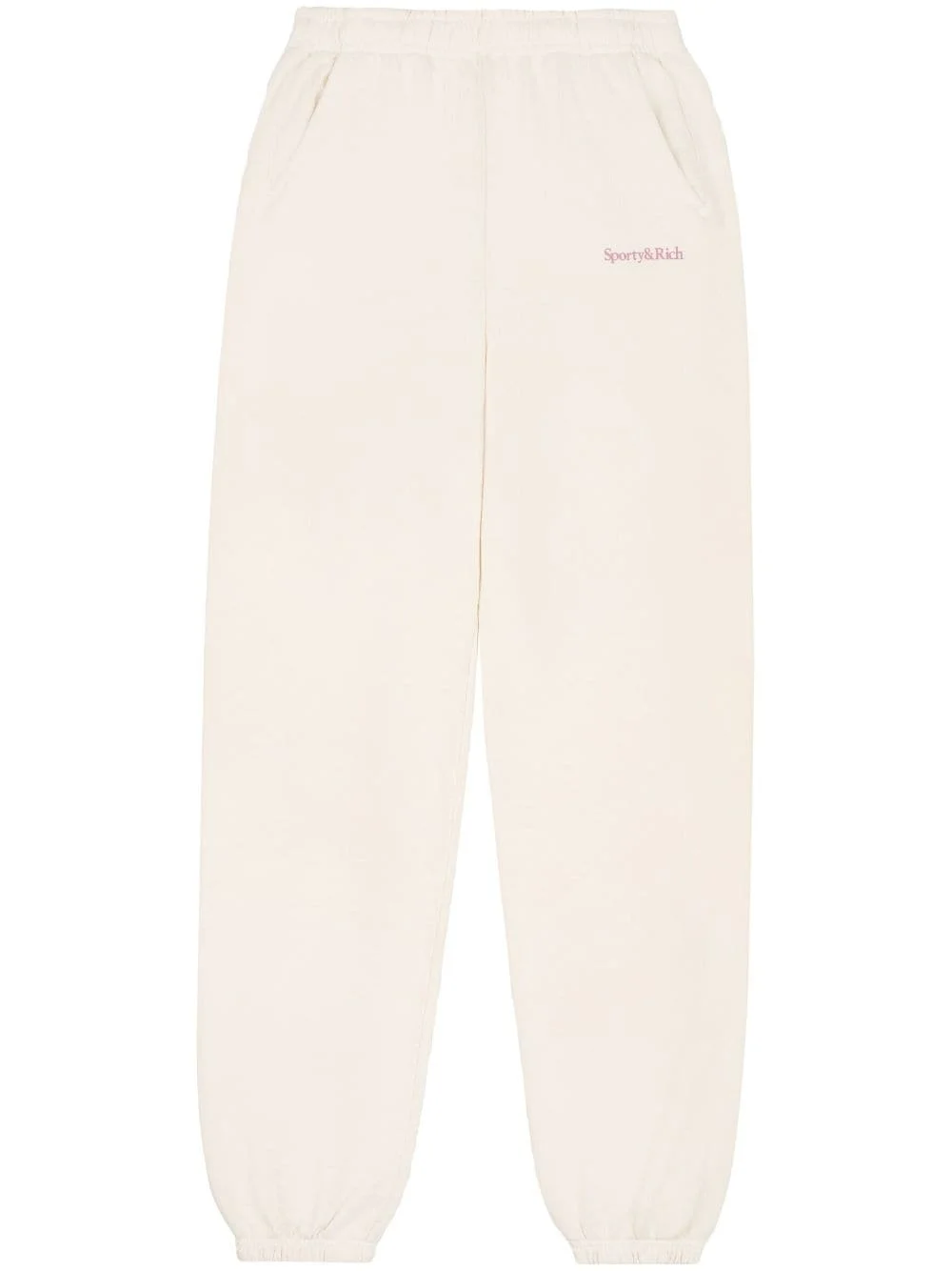 Serif logo-print track pants Highlights - Cream white/light pink - Cotton - Jersey fleece - Logo print to the front - Elasticated waistband - Slip-on style - Slim cut - Two side slit pockets - Elasticated ankles - When buying this unisex item, keep in mind that it is graded in standard men's sizing. Made in United States Composition Cotton 100%