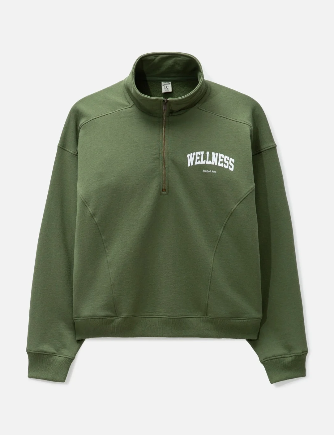 - Sporty & Rich - Wellness Ivy Quarter Zip - Fits slightly oversized - Long sleeves - Short length - 11.5 oz cotton fabric - High-neck - Ribbed cuffs and hem - Printed text on left chest - Shrink free - Garment dyed - Two side pockets - Straight hem - Color: Moss/White - Material: 100% Cotton - See more Sweatshirts and Clothing SIZING - Model wears size S - Model measures: Height 179cm, Chest 32”/81cm, Waist 23’’/58.42cm, Hip 35’’/88.9cm