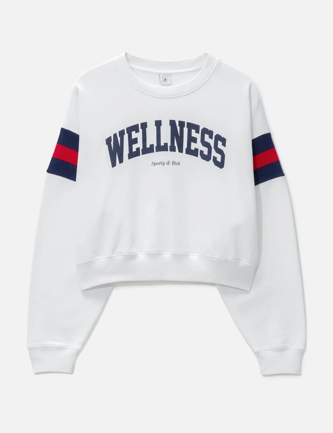 - Sporty & Rich - Wellness Ivy Rugby Crewneck - Made of 11.5 oz cotton - Crewneck - Pre-shrunk - Slightly oversized - Garment Dyed - Cropped length - Printed stripes around the arms - Made in Portugal - Color: White/ Bright Red/ Navy - Material: 100% Cotton - See more Sweatshirts and Clothing SIZING Men - Model wears size L - Model measures: Height 188cm, Chest 36"/92cm, Waist 30"/76cm, Hip 37"/94cm - Model wears size S - Model measures: Height 177cm, Chest 32"/81cm, Waist 23.5"/59.7cm, Hip 33’’/83.8cm