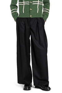 DESCRIPTION - Black structured wool suiting with belt loops and button closure. Front pleats and a wide, slightly flared leg reduce tailoring to essential form, while precise construction transforms classic suiting into sculptural, modern minimalism — George s signature approach to conceptual menswear. - Black - Structured wool suiting - Belt holes - Button closure - Front pleats - Wide leg - Slightly flared fit DETAILS - Made in: Italy - Composition: 100% Wool - Model code: SSDMA25065 BLACK - Item ID: 9938593710422