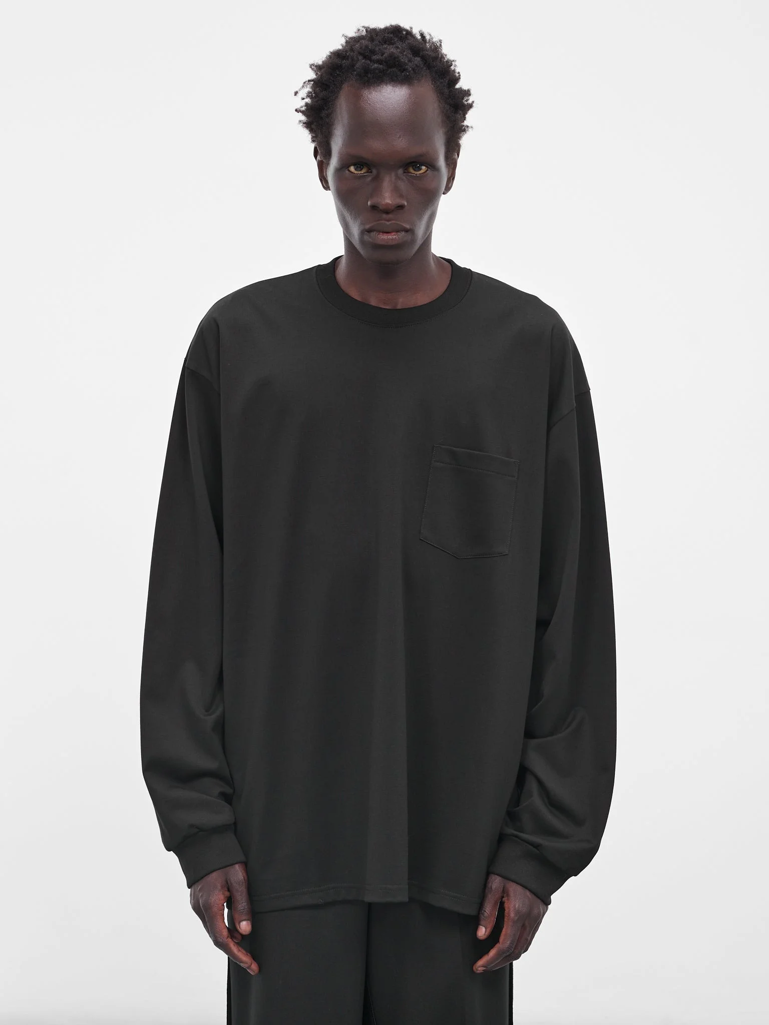 This black long-sleeve t-shirt pairs dropped shoulders with a relaxed fit, highlighting a sculptural silhouette finished with a chest patch pocket and ribbed cuffs. Featuring: • Oversized fit • Crewneck • Dropped shoulders • Long sleeves with cuffs • Chest patch pocket • Made in Japan • 100% Cotton • Standard sizing Model is 5'11.5" wearing size M. Shoulders: 16" Chest: 32.5" Waist: 30"