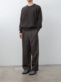 The Easy Wide Trousers are a Ssstein signature item and feature a wide-leg silhouette with both inward and outward tucks at the front. They are made from high-density wool gabardine using Super120’s yarns, resulting in a smooth, durable surface with depth through piece-dyeing. Details include a partial elastic waistband with inner drawstrings, creased legs for a clean line, side pockets and back welt pockets. - Made in Japan - 100% Wool - Available in Gray Khaki - The model is 6'1"/185cm and wears size M