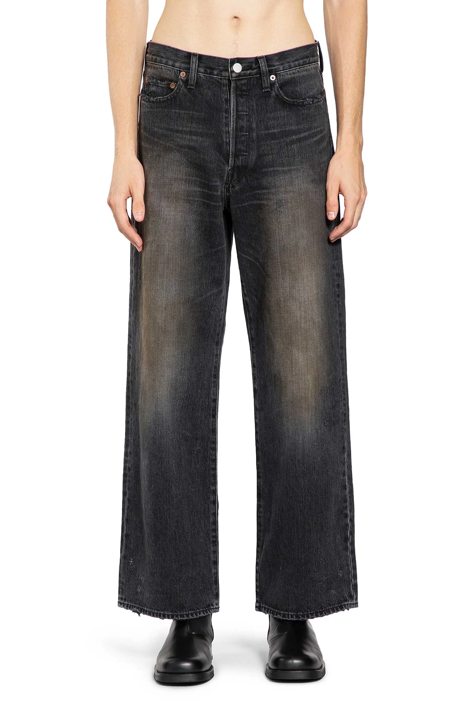 DESCRIPTION - Black - Stone washed - Bleaching overdyed and sprayed - distressed details - Low-rise - Belt holes - Button closure - 5 pockets - Straight leg - Relaxed fit DETAILS - Made in: Japan - Composition: 100% Cotton - Model code: ST1234 BLACK - Item ID: 9837576847702