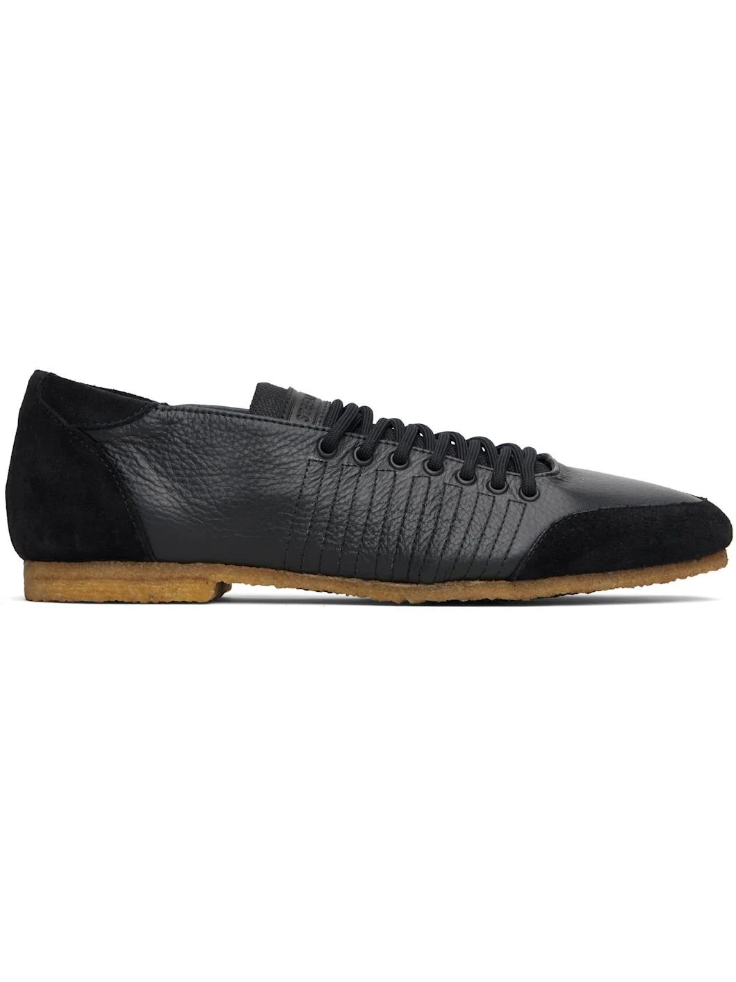 Low-top grained leather and suede sneakers. · Lace-up closure · Logo patch at padded tongue · Padded collar · Topstitching at sides · Buffed leather lining · Crepe-rubber sole Supplier color: Black/Black Upper: leather. Sole: rubber. Made in Portugal 252300M225004