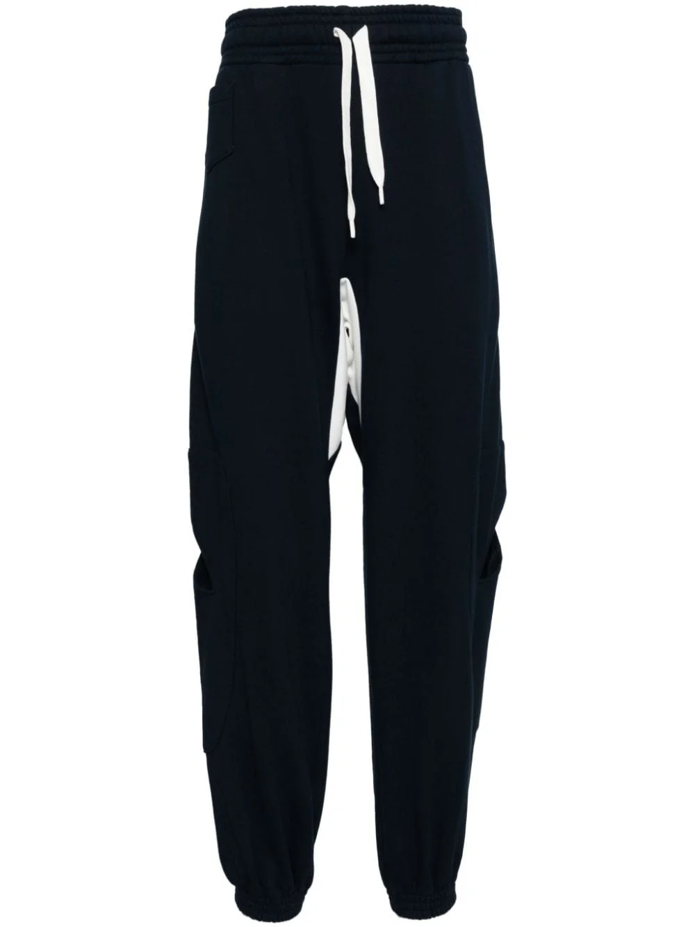 cut-out track pants Highlights - Navy blue - Cotton - Jersey texture - Elasticated drawstring waistband - Cut-out detailing - Panel detailing - Two front patch pockets - Two side inset pockets - Rear patch pocket - Tapered leg - Elasticated ankles - French terry lining Made in United Kingdom Composition Cotton 100% SIZE & FIT Model measurements Height 6 ft 2 in(1.87 m) Bust/Chest 33.07 in(84 cm) Hips 35.43 in(90 cm) Waist 26.77 in(68 cm) FittingInformation Designed for a relaxed tapered leg, allowing a comfortable loose fit above the knee with a closer fit towards the calves The elasticated hem at the ankle allows for movement and a comfortable fit Made from a midweight non-stretch fabric, this piece offers minimal elasticity when worn