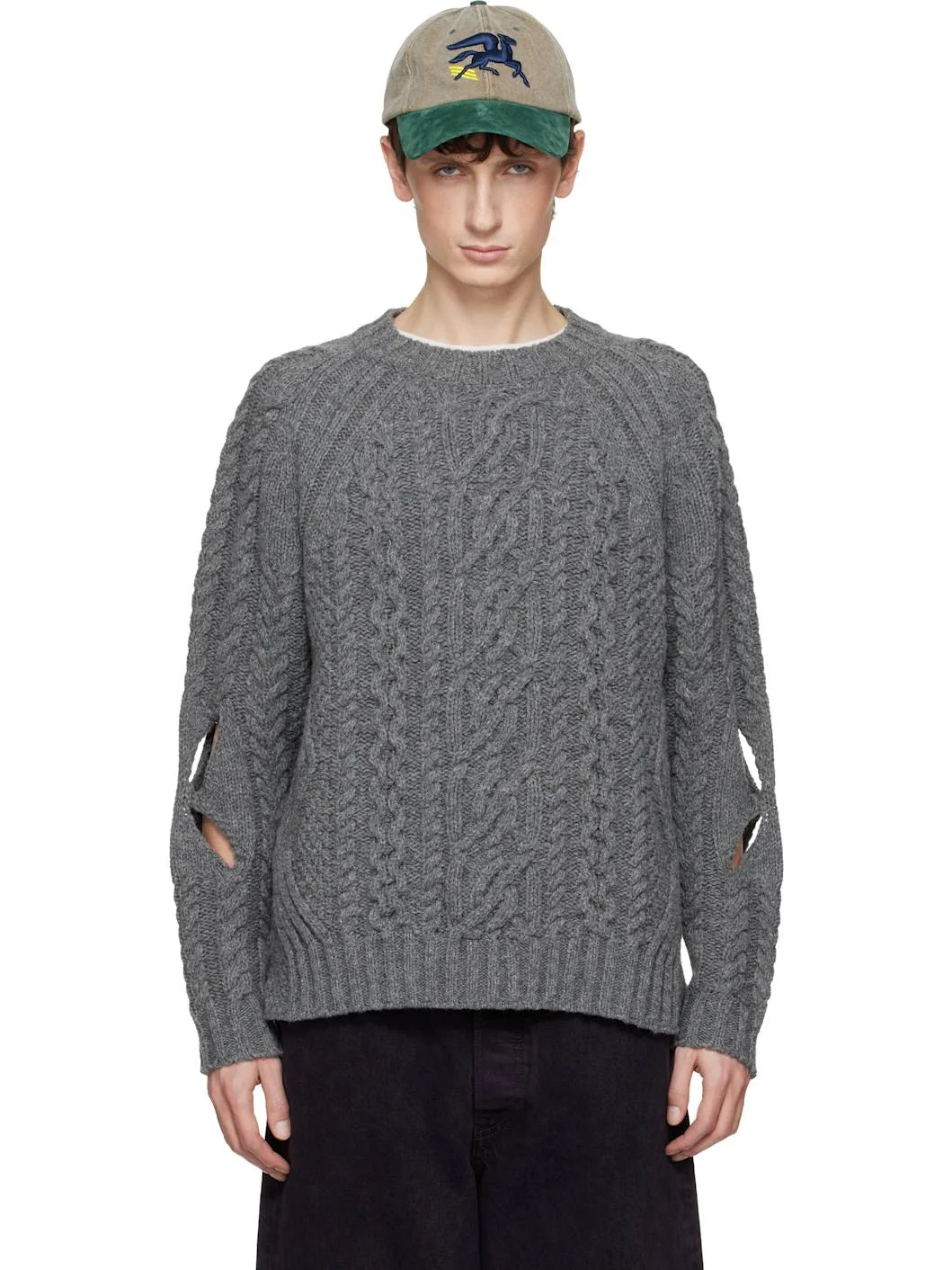 Cable-knit wool sweater. · Rib-knit crewneck, hem, and cuffs · Cutouts at raglan sleeves · Intarsia logo at back collar Supplier color: Grey 100% wool. Made in United Kingdom 252300M201002