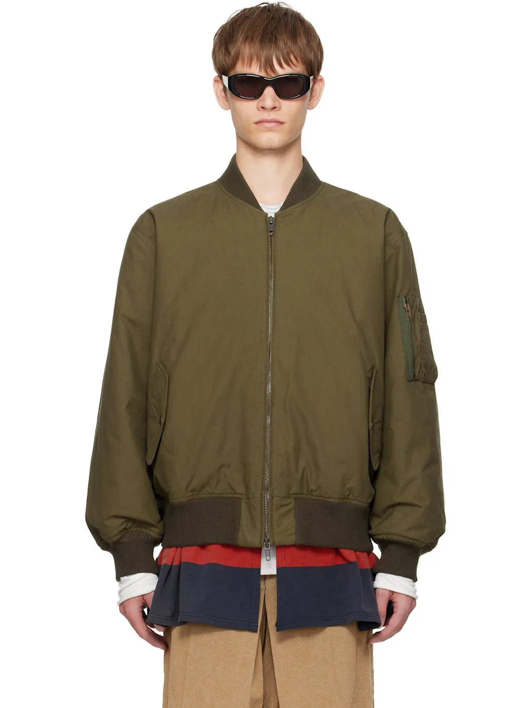 Padded cotton canvas bomber jacket. · Paneled construction · Rib-knit stand collar, hem, and cuffs · Two-way zip closure · Flap pockets at waist · Striped jersey trim at hem · Utility pocket and pen slots at sleeve · Welt pockets at interior · Full satin twill lining Each item is unique. Please note coloration and pattern may vary. Supplier color: Green Body: 100% cotton. Lining: 100% viscose. Made in United Kingdom 252300M175000
