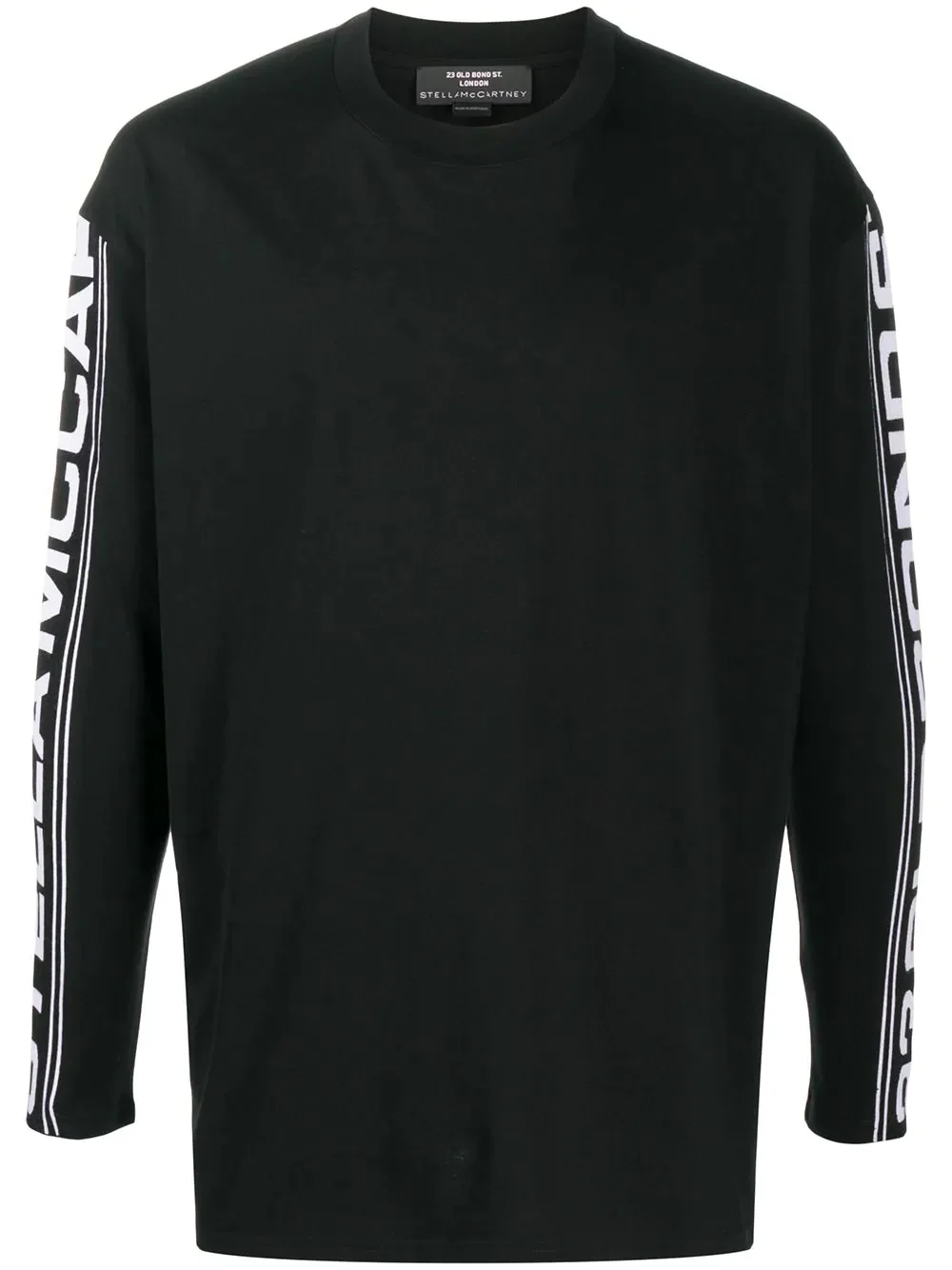 logo sleeve round neck top Two for you. This round neck top from Stella McCartney features a double logo print for twice the stylish statement. You'll be making a lasting impact wherever you go. Highlights - Black/white - Cotton and viscose-blend - Round neck - Embroidered logo at the sleeve - Long sleeves - Straight hem Imported Composition Cotton 100%, Viscose 85%, Polyester 15% SIZE & FIT Model measurements Height 6 ft 2 in(1.87 m) Bust/Chest 37.79 in(96 cm) Hips 37.79 in(96 cm) Waist 30.31 in(77 cm) FittingInformation This piece fits true to size. We recommend you get your regular size Cut for a relaxed fit Made with a mid-weight fabric Washing instructions Hand Wash