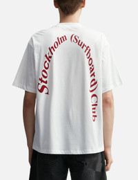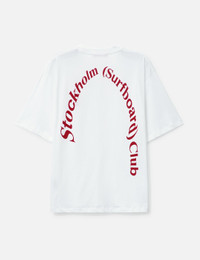 - STOCKHOLM SURFBOARD CLUB - Curve Logo Regular T-shirt - Midweight cotton fabric - Crewneck - Logo print at rear - Straight hem - Color: White - Material: 100% Organic Cotton - See more SS T-Shirts, T-Shirts and Clothing SIZING - Model wears size M - Model measures: Height 186cm, Chest 34”/86cm, Waist 28”/71cm, Hip 36”/91cm