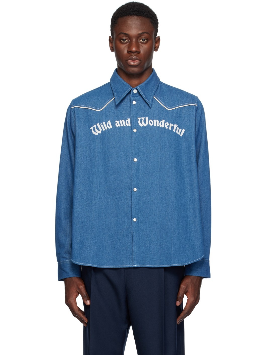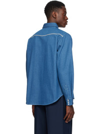 Non-stretch denim shirt. · Spread collar · Press-stud closure · Piping at front and back yoke · Text embroidered at chest · Shirttail hem · Three-press-stud barrel cuffs · Contrast stitching in white Supplier color: Blue