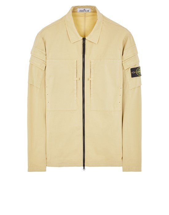 FABRIC RESEARCH AND TREATMENT Overshirt in stretch cotton gabardine. Garment dyed. STYLE Regular fit. Two large patch pockets on chest with standing entrance and Velcro fastening; three eyelets on the pockets’ side. Two overlapping pockets on the left sleeve with flap and Velcro fastening; Stone Island badge on the bottom pocket. Tightening snap at cuffs. Two-way zipper fastening. COMPOSITION 97% Cotton, 3% Elastane / Spandex