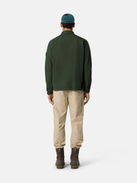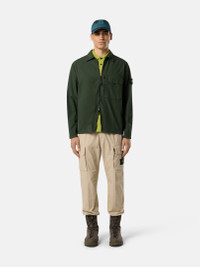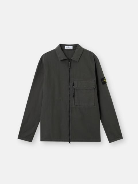 Overshirt in canvas-weave cotton, featuring layered chest pockets and snap-adjustable cuffs, with two-way zipper. Garment dyed. FABRIC RESEARCH AND TREATMENT Overshirt in canvas weave cotton. The garment dyeing procedure includes specific recipes. STYLE AND FIT On left side of chest, one bellows pocket with three buttons under flap, overlapping a second pocket with standing entrance and zipper. Stone Island badge on left sleeve. Tightening snap at cuffs. Two-way zipper fastening. Comfort fit. COMPOSITION AND CARE 100% Cotton