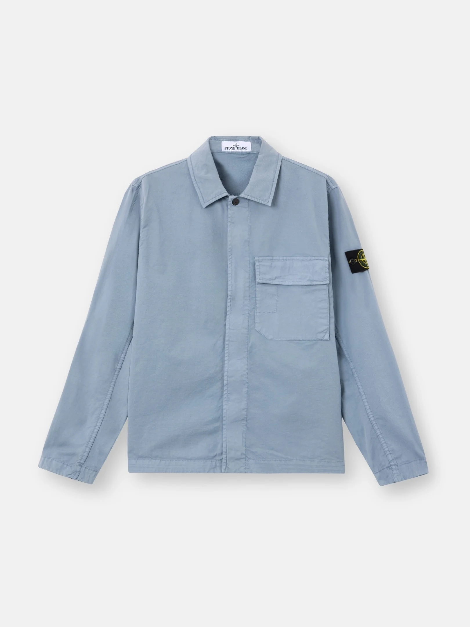 Overshirt in stretch organic cotton twill, featuring buttoned chest pockets, adjustable snap cuffs, and a concealed two-way zipper fastening. Garment dyed. FABRIC RESEARCH AND TREATMENT Overshirt in stretch organic cotton twill. Garment dyed. STYLE AND FIT Bellows chest pockets with flap and concealed button fastening, with second smaller pocket inside. Stone Island badge on left sleeve. Adjustable cuffs with snap. Concealed two-way zipper fastening with snaps at top and bottom of placket. Regular fit. COMPOSITION AND CARE 97% Cotton 3% Elastane / Spandex