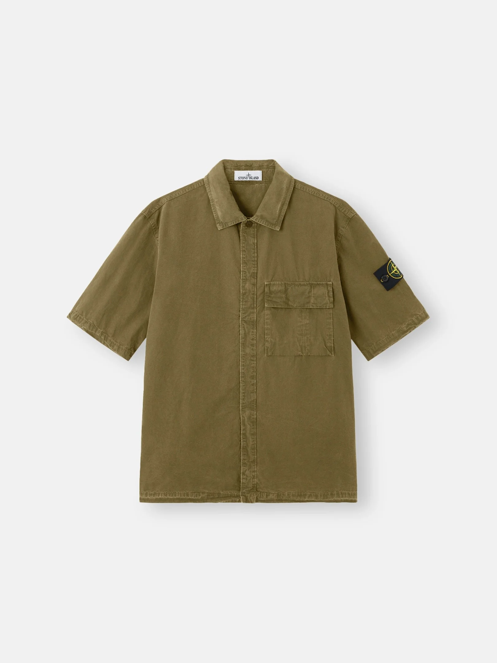Short-sleeve shirt in brushed organic cotton canvas, featuring a dual chest pocket and snap fastening. Garment dyed with the “OLD” treatment for a slightly worn appearance. FABRIC RESEARCH AND TREATMENT Short-sleeve shirt in brushed organic cotton canvas. Garment dyed with the “OLD” treatment, an exclusive dyeing treatment and subsequent fading on the finished garment for a slightly worn and three-dimensional appearance. STYLE AND FIT Dual-compartment bellows chest pocket with flap and concealed double snap. Back yoke. Stone Island badge on left sleeve. Concealed snap fastening. Comfort fit. COMPOSITION AND CARE 100% Cotton