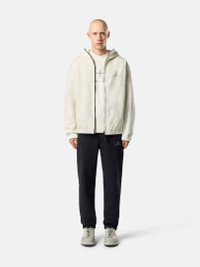Hooded zipper-up shirt in stretch cotton moleskin, featuring an archival Stone Island logo, drawstring hood, pockets, and a high-neck two-way zipper fastening. Garment dyed. FABRIC RESEARCH AND TREATMENT Hooded zipper-up shirt in stretch cotton moleskin. Garment dyed. STYLE AND FIT Shaped drawstring hood. Embroidered archival Stone Island logo at chest. Standing hand pockets with snap. Elasticated cuffs and hem. High-neck two-way zipper fastening. Regular fit. COMPOSITION AND CARE Garment: 97% Cotton 3% Elastane / Spandex. Lining: 100% Cotton