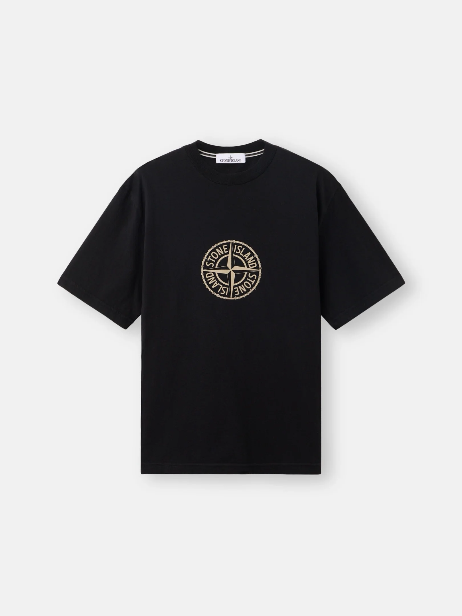Short-sleeve T-shirt in organic cotton jersey, featuring a Compass logo print on the chest and text on the back referencing the Stone Island Colour Laboratory. Garment dyed. FABRIC RESEARCH AND TREATMENT Short-sleeve T-shirt in organic cotton jersey with “All Around Compass” print. Garment dyed. STYLE AND FIT Ribbed neckline. On chest, print of Compass logo and raised print of the text “engineering and garment dyeing expertise” around the edge. On back, print of text about Colour Laboratory. Regular fit. COMPOSITION AND CARE Garment: 100% Cotton Ribbing: 100% Cotton
