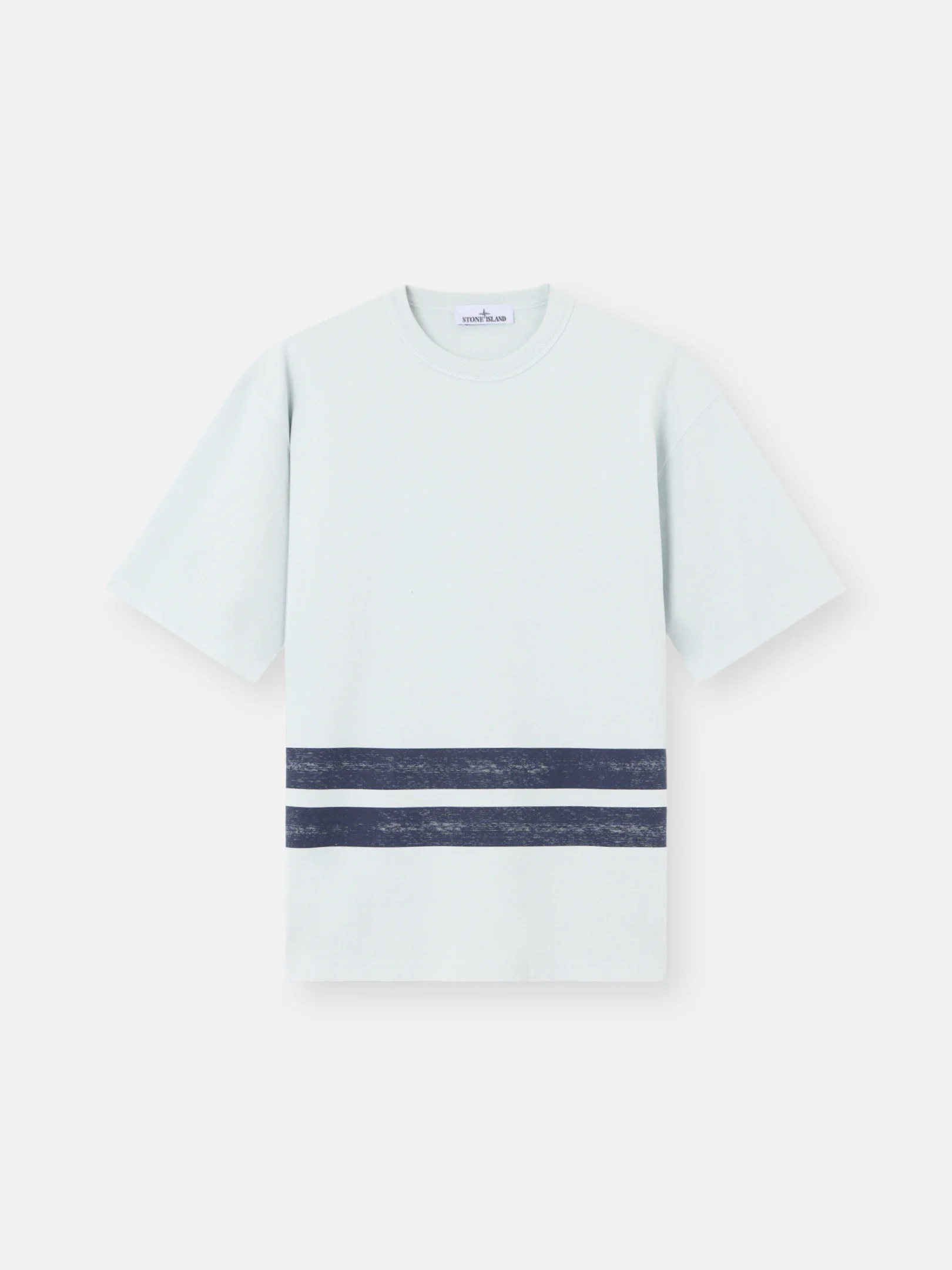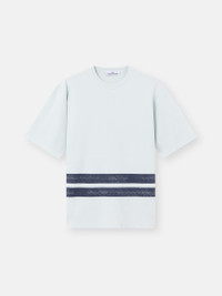 Short-sleeve T-shirt in combed organic cotton jersey featuring two printed bands at the waist and Stone Island Marina lettering on the back. Garment dyed. FABRIC RESEARCH AND TREATMENT Short-sleeve T-shirt in combed organic cotton jersey. Garment dyed. STYLE AND FIT Ribbed neckline. Two large printed bands around lower waist; in back, top band features print of Stone Island Marina lettering. Oversized fit. COMPOSITION AND CARE Garment: 100% Cotton. Ribbing: 94% Cotton 6% Elastane / Spandex
