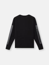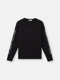 Long-sleeve T-shirt in organic cotton jersey with two-needle overlock seams, Stone Island logo on chest, and reflective 'Institutional Three' print on sleeves. Garment dyed. FABRIC RESEARCH AND TREATMENT Long-sleeve T-shirt in organic cotton jersey. Garment dyed. STYLE AND FIT Ribbed neckline. Raglan sleeves. Two-needle overlock seams on neckline, shoulders and bottom hem. Stone Island logo print on center of chest. On sleeves, reflective 'Institutional Three' print, a reinterpretation of the Stone Island lettering. Slim fit. COMPOSITION AND CARE Garment: 100% Cotton. Ribbing: 100% Cotton