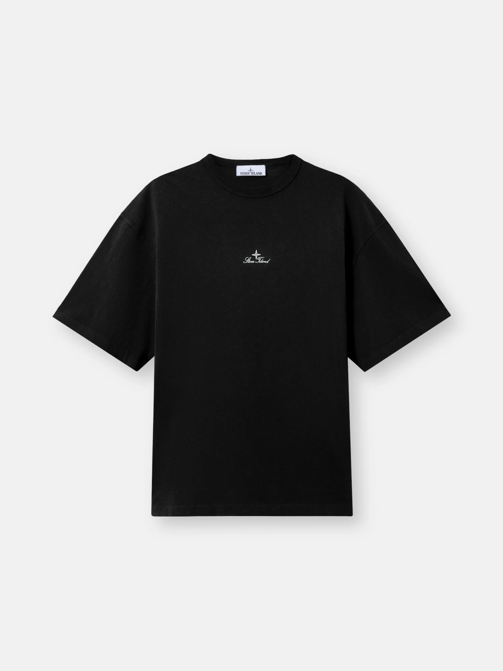 Short-sleeve T-shirt in organic cotton jersey, featuring a ribbed neckline and Stone Island logo script embroidery on the chest. Garment dyed. FABRIC RESEARCH AND TREATMENT Short-sleeve T-shirt in organic cotton jersey. Garment dyed. STYLE AND FIT Ribbed neckline. Stone Island logo script embroidery on chest. Regular fit. COMPOSITION AND CARE Garment: 100% Cotton Ribbing: 100% Cotton