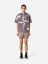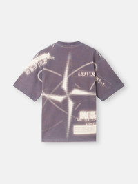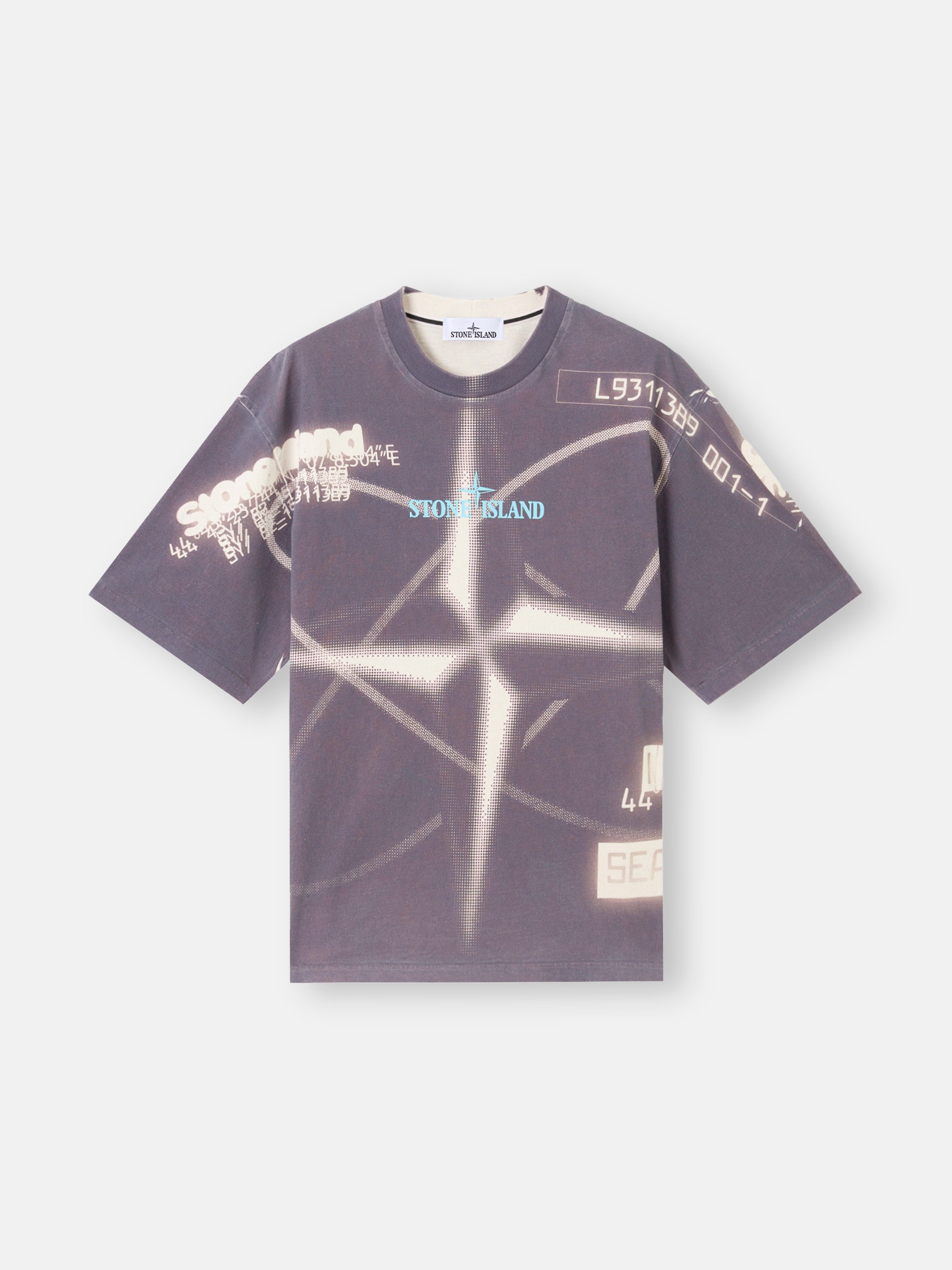 Short-sleeve T-shirt in combed organic cotton jersey, featuring an all-over print made with Stone Island's iconic 'Luce' technique, creating photograph-like patterns. Printed and overdyed. FABRIC RESEARCH AND TREATMENT Short-sleeve T-shirt in combed cotton jersey. Printed and overdyed. STYLE AND FIT Ribbed neckline. Printed Stone Island logo in the center of the chest. All-over ‘Y2K Compass One’ print with stylized Stone Island lettering and Compass, made with the Stone Island iconic ‘Luce’ technique. In a dark room, the garments are soaked in a special light-sensitive bath. They are then individually exposed to vivid light, with specially designed calotypes in between, so to create 'photographic' patterns and designs on the garment surface. The special feature of this technique is the impalpable feel of the print. Regular fit. COMPOSITION AND CARE Garment: 100% Cotton. Ribbing: 100% Cotton