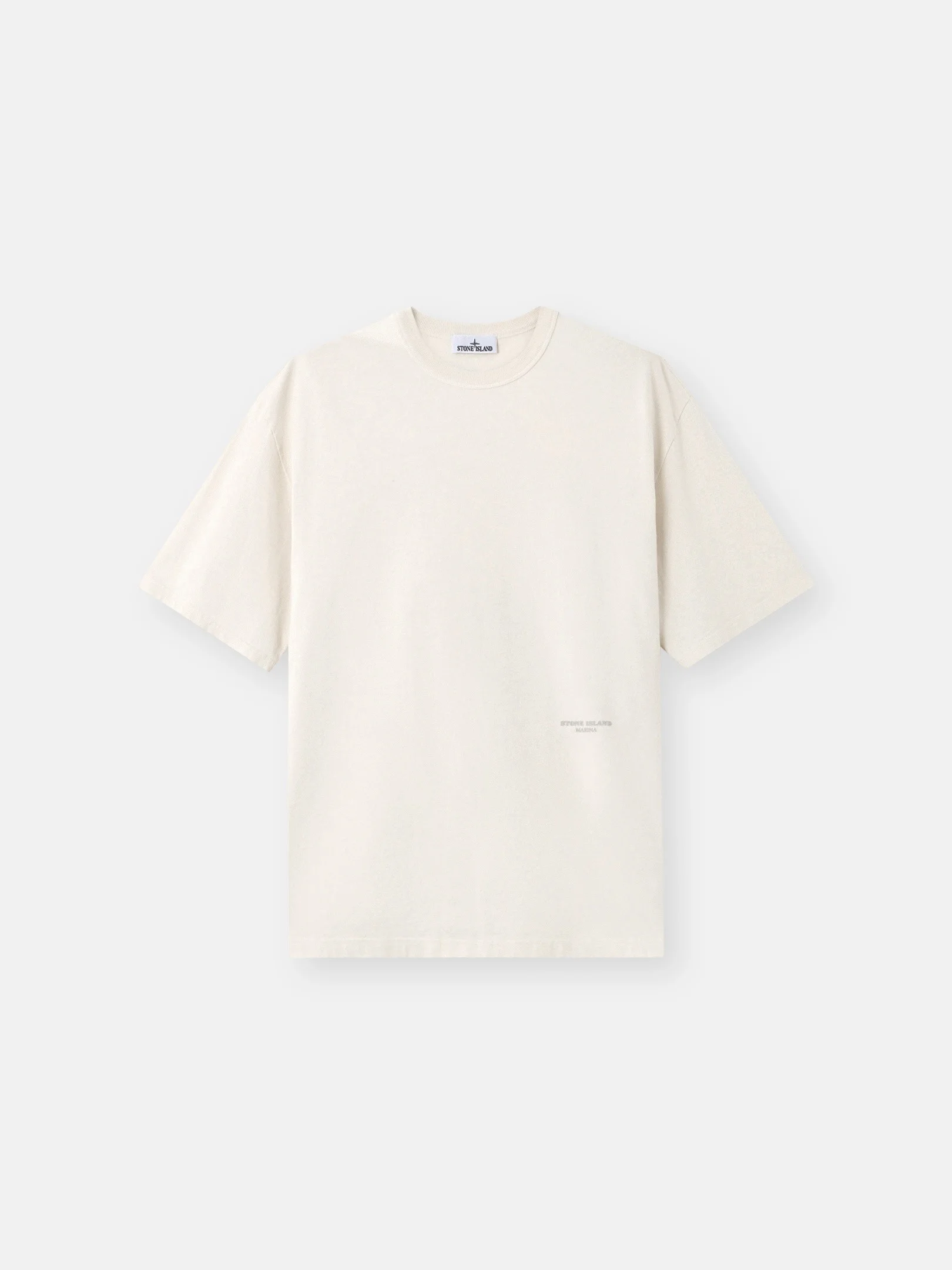Short-sleeve T-shirt in combed organic cotton jersey, featuring a contrasting ribbed shoulder insert and a raised Stone Island Marina print on the front. Garment dyed. FABRIC RESEARCH AND TREATMENT Short-sleeve T-shirt in combed organic cotton jersey. Garment dyed. STYLE AND FIT Ribbed neckline. Contrasting ribbed triangular insert on right shoulder. Raised Stone Island Marina print on bottom left. Oversized fit. COMPOSITION AND CARE Garment: 100% Cotton Garment Details: 97% Polyester 3% Elastane / Spandex Collar Rib: 100% Cotton