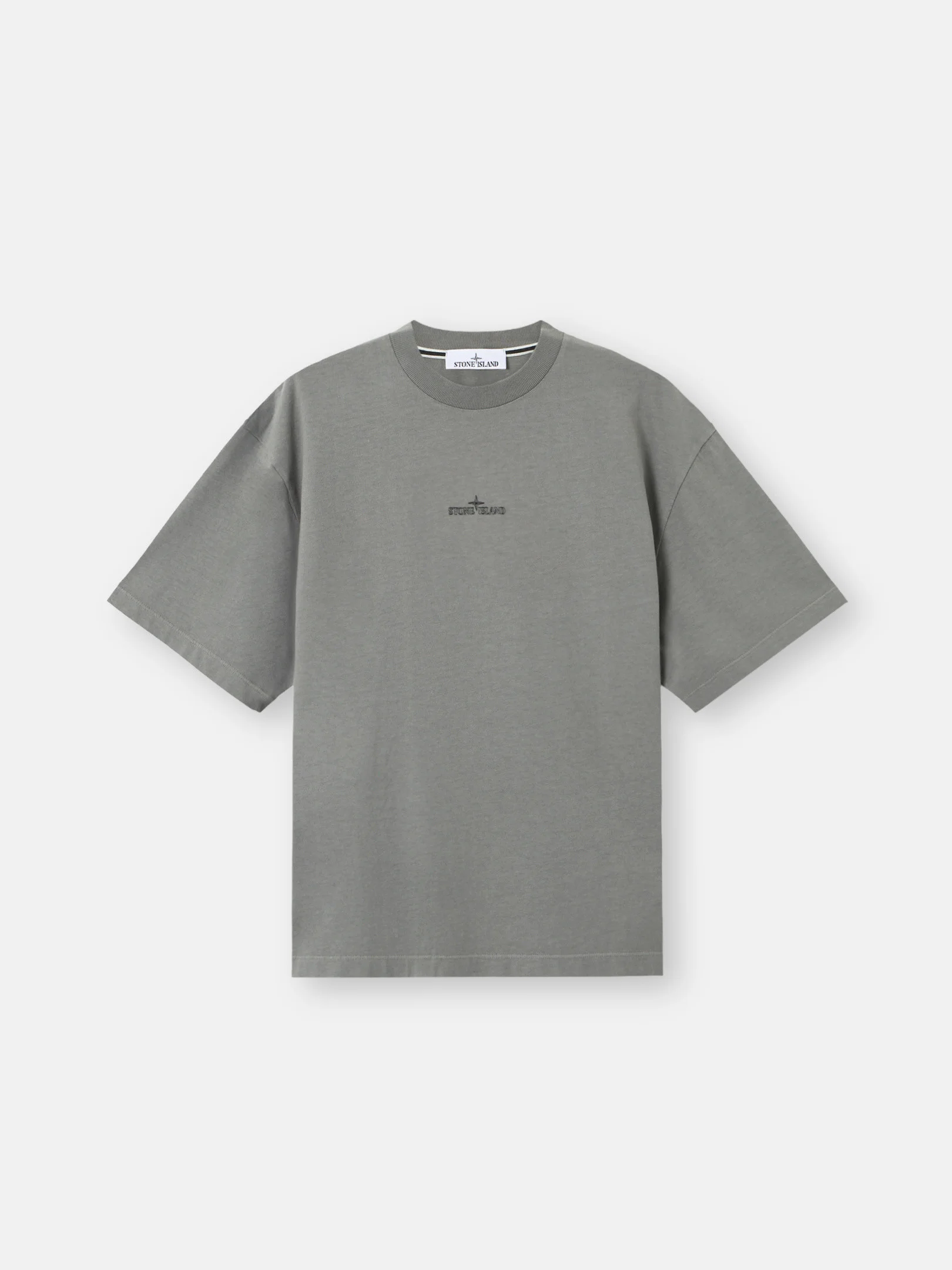 Short-sleeve T-shirt in combed and mercerized cotton jersey with 'Megacity Sky' embroidery, featuring a logo on the chest and abstract city motif on the back. Garment dyed. FABRIC RESEARCH AND TREATMENT Short-sleeve T-shirt in combed organic cotton jersey and mercerized cotton jersey with ‘Megacity Sky’ embroidery. Garment dyed. STYLE AND FIT Ribbed neckline. Stone Island logo embroidery on chest. Embroidery of abstract city motif and Stone Island lettering on back. Regular fit. COMPOSITION AND CARE External Fabric: 100% Cotton. Ribbing: 100% Cotton. Decoration: 100% Polyester