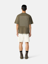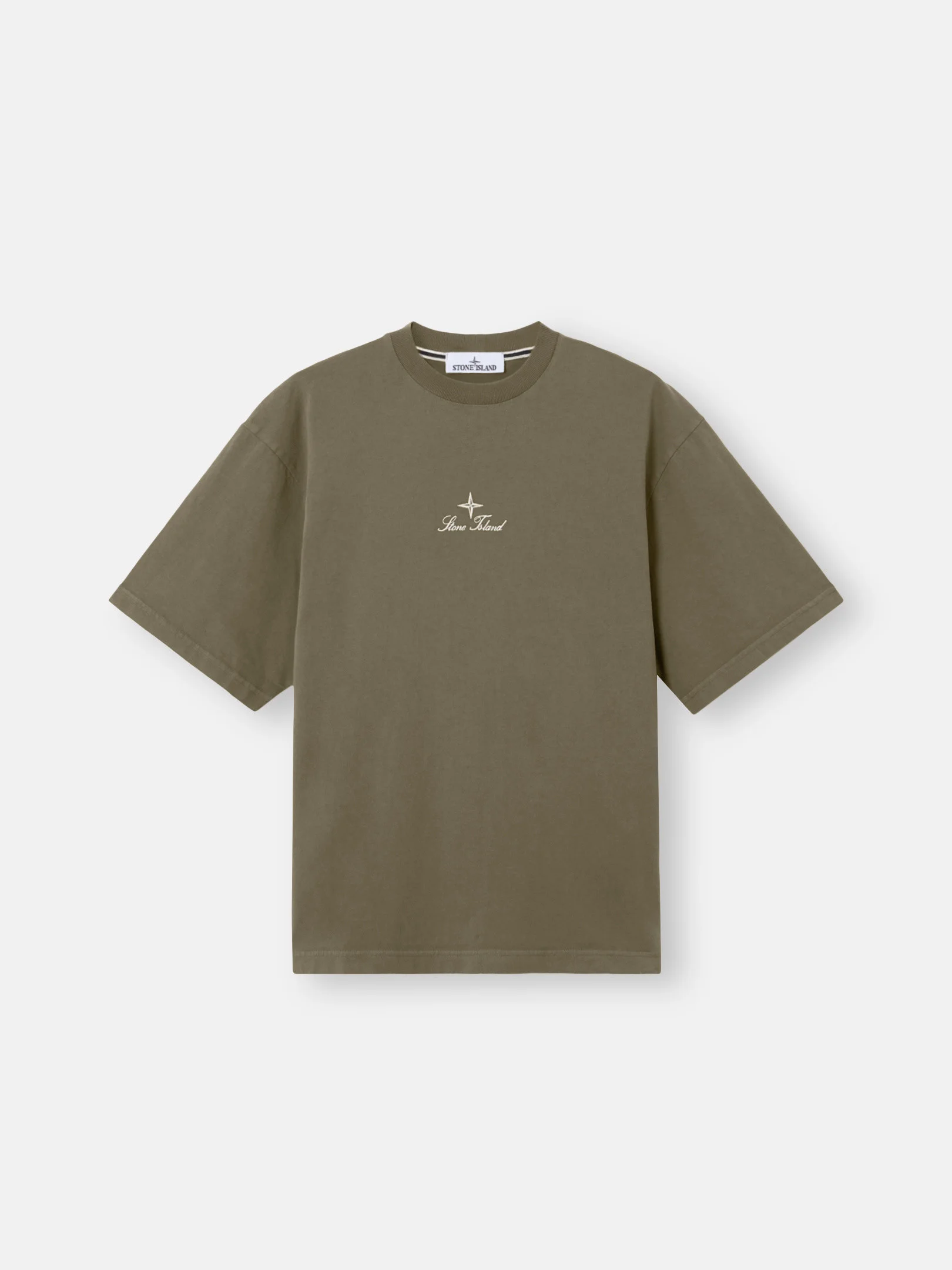 Short-sleeve T-shirt in combed organic cotton jersey with multiaxial and Japanese character embroidery on the back. Garment dyed. FABRIC RESEARCH AND TREATMENT Short-sleeve T-shirt in combed organic cotton jersey with ‘Multiaxial_Sashiko’ embroidery. Garment dyed. STYLE AND FIT Ribbed neckline. Embroidery of Stone Island logo with cursive lettering on chest. Large embroidery of multiaxial pattern and ‘Stone Island’ written in Japanese characters on back. Regular fit. COMPOSITION AND CARE Garment: 100% Cotton. Ribbing: 100% Cotton. Decoration: 100% Polyester