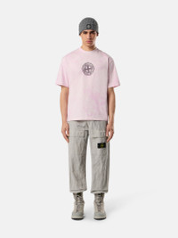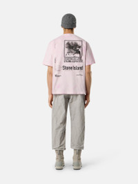 Short-sleeve T-shirt in organic cotton jersey with 'Megacity Sky' print and all-over motif created through the 'Paintball' treatment with reactive dye bursts. Each piece is unique. Garment dyed. FABRIC RESEARCH AND TREATMENT Short-sleeve T-shirt in combed organic cotton jersey with ‘Megacity Sky’ print and all-over motif created using the ‘Paintball’ treatment. Inside a dyeing machine, bursts of one or more reactive gelatinous dyes are applied to the fabric, binding to the material through a special technique. The random nature of the pattern renders each garment unique and unrepeatable. STYLE AND FIT Ribbed neckline. Stone Island Compass logo print on chest. Large print on back featuring industrial landscape, Stone Island lettering, and logo. Regular fit. COMPOSITION AND CARE Garment: 100% Cotton. Ribbing: 100% Cotton