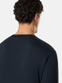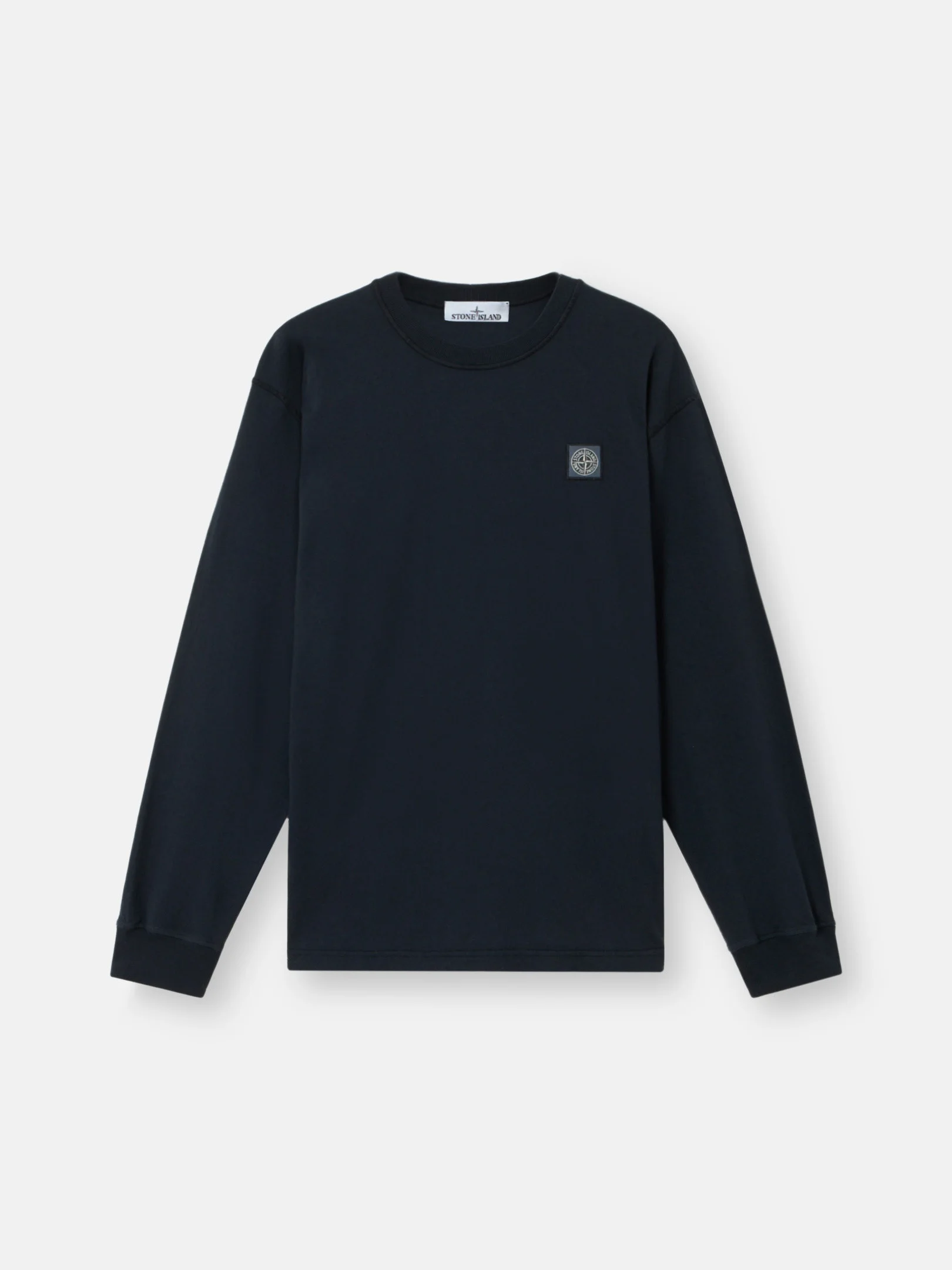 Long-sleeve T-shirt in organic cotton jersey, featuring a Compass logo patch on the chest, overlock seams, and lunette detail on the back. Garment dyed with the 'Fissato' effect. FABRIC RESEARCH AND TREATMENT Long-sleeve T-shirt in organic cotton jersey. Garment dyed and treated with the ‘Fissato’ effect, a water-soluble resin treatment process and garment dyeing technique creating a three-dimensional appearance. STYLE AND FIT Ribbed neckline. Stone Island Compass logo patch on chest. Overlock seams. Ribbed cuffs. Lunette under back neckline with inner lining. Slim fit. COMPOSITION AND CARE Garment: 100% Cotton. Ribbing: 100% Cotton