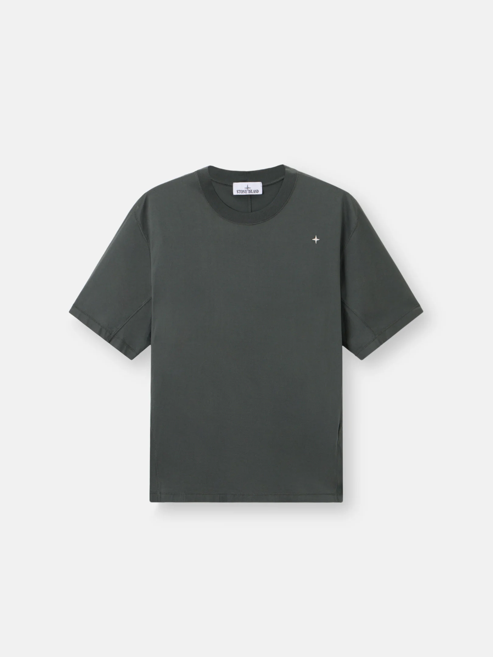 Short-sleeve T-shirt in mercerized cotton jersey with ribbed neckline, Stone Island star embroidery, and overlock seams. Garment dyed. FABRIC RESEARCH AND TREATMENT Short-sleeve T-shirt in mercerized cotton jersey. Garment dyed. STYLE AND FIT Ribbed neckline. Stone Island star embroidery on left side of chest. Overlock seams. Regular fit. COMPOSITION AND CARE Garment: 100% Cotton. Ribbing: 100% Cotton