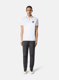 Short-sleeve polo shirt in organic cotton and elastane pique, featuring stripe details on the collar and sleeve edges and Compass patch on chest, with two-button fastening. FABRIC RESEARCH AND TREATMENT Short-sleeve polo shirt in 95% organic cotton / 5% elastane pique. STYLE AND FIT Ribbed collar with two parallel contrast-colored stripes and two-button fastening. Stone Island Compass logo patch on chest. Ribbed sleeve edge with parallel contrast-colored stripes. Bottom side slits with inner striped tape trim. Slim fit. COMPOSITION AND CARE Garment: 95% Cotton 5% Elastane / Spandex. Collar Rib: 97% Cotton 3% Polyester. Cuff Rib: 96% Cotton 4% Polyester