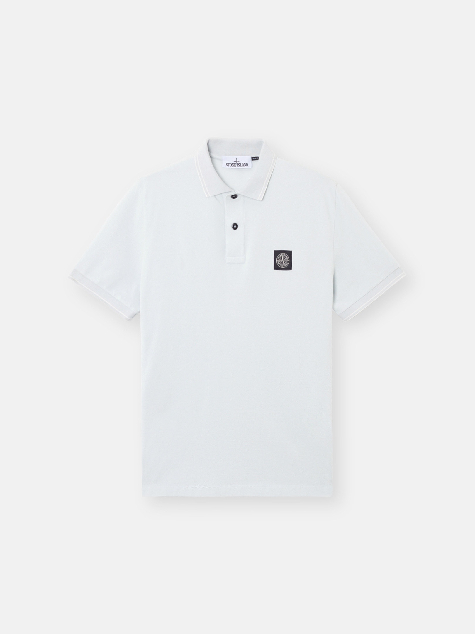 Short-sleeve polo shirt in organic cotton and elastane pique with two buttons, Compass logo on chest, and contrast-colored stripes on collar and sleeve edges. FABRIC RESEARCH AND TREATMENT Short-sleeve polo shirt in 95% organic cotton / 5% elastane pique. STYLE AND FIT Ribbed collar with two parallel contrast-colored stripes and two-button fastening. Stone Island Compass logo patch on chest. Ribbed sleeve edge with parallel contrast-colored stripes. Bottom slit on sides. Slim fit. COMPOSITION AND CARE 95% Cotton 5% Elastane / Spandex