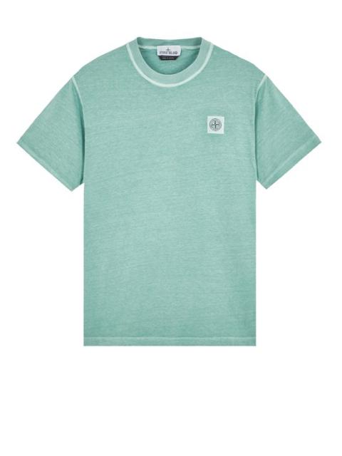 FABRIC RESEARCH AND TREATMENT Short-sleeve T-Shirt in organic cotton jersey. Garment dyed and treated with the 'FISSATO' effect, a water-soluble resin treatment process and garment dyeing technique creating a three-dimensional appearance. COMPOSITION 100% Cotton