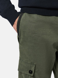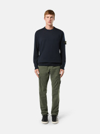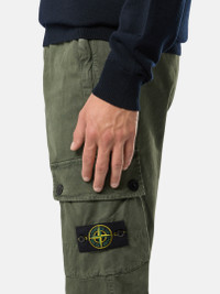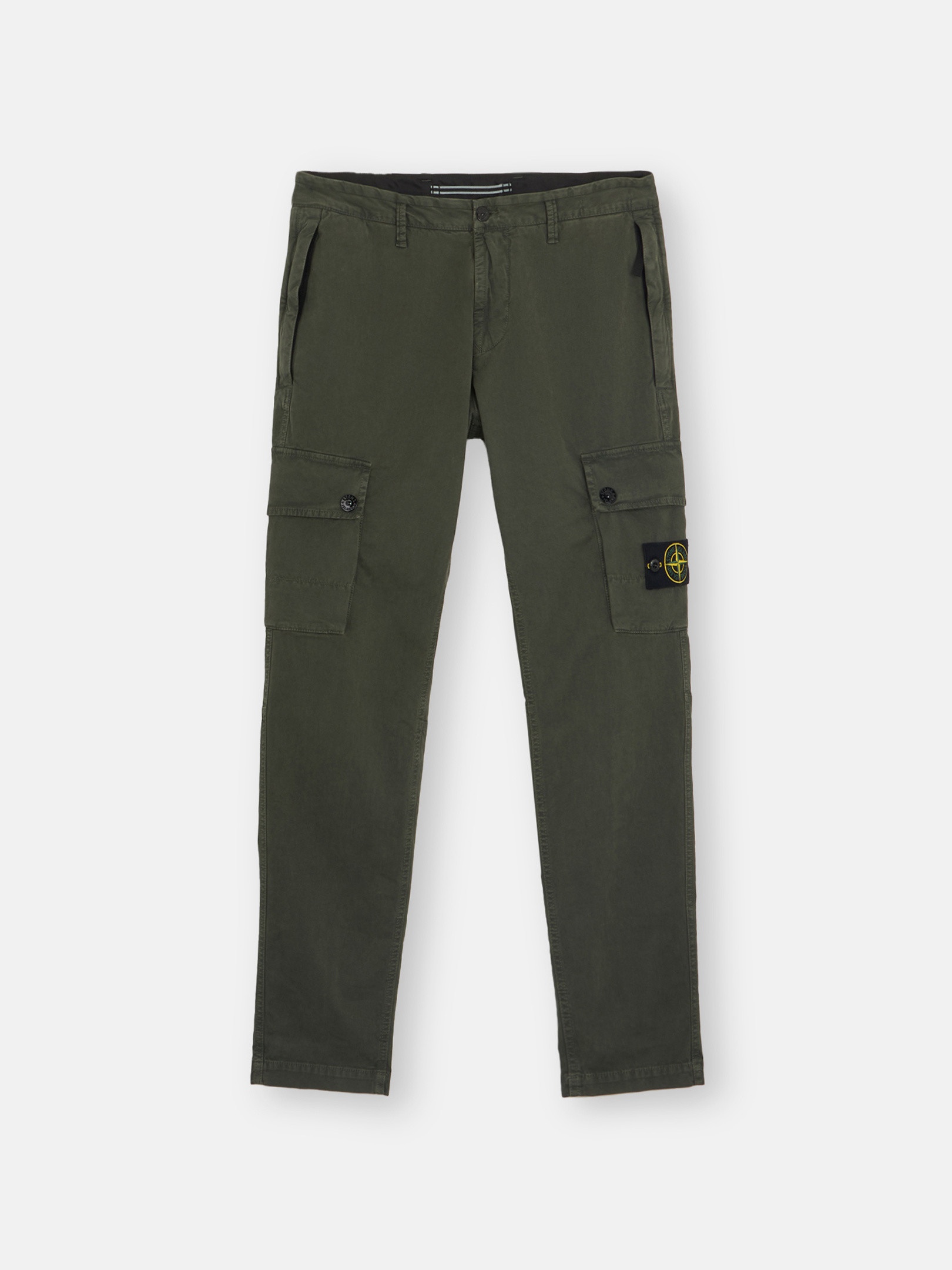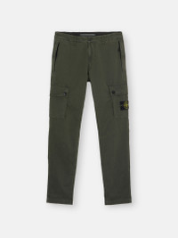 Cargo pants in stretch broken-twill organic cotton garment dyed with the exclusive 'OLD' treatment, lending a slightly worn and three-dimensional appearance to the item. FABRIC RESEARCH AND TREATMENT Cargo pants in stretch broken-twill organic cotton. Garment dyed with the ‘OLD’ effect, an exclusive dyeing treatment and subsequent fading on the finished garment to create a slightly worn and three-dimensional appearance. STYLE AND FIT Welt pockets with zipper closure. One slit pocket with hidden snap fastening on the back. Bellows pocket on each leg with flap and snap fastenings; the left one features the Stone Island badge. Zipper and button fly. Slim fit. COMPOSITION AND CARE External Fabric: 97% Cotton 3% Elastane / Spandex. Lining: 100% Cotton
