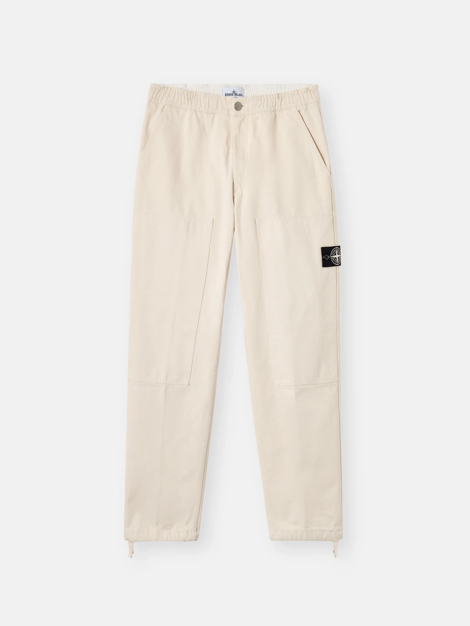 Chino pants made in part with recycled cotton derived from an elaborate recovery and regeneration process that reuses material scraps from the Stone Island production chain. Washed. FABRIC RESEARCH AND TREATMENT The Stone Island Raw Beauty project reuses cotton material scraps from the Stone Island production chain. The scraps selected in the production plants are reprocessed to obtain new blended yarns, containing at least 50% recovered material. The fabrics derived from this elaborate recovery and regeneration process are used for new garments. Chino pants made from 60% recycled cotton and 40% conventional cotton. The unbleached fabric features some aesthetic impurities that are typical of raw cotton and should be considered an intrinsic and natural part of the material. Washed. STYLE AND FIT Slanted hand pockets. On back, two patch pockets and one small vertical pocket on right side. Rectangular panel on legs. White Stone Island fabric research badge on left leg. Cotton tape drawstring in cuffs. Elasticated waistband with inner cotton tape drawstring. Zipper and button fly with oval disc on buttonhole inspired by debossed rubber patches of archival Stone Island garments from the 1980s. Relaxed fit. COMPOSITION AND CARE 100% Cotton
